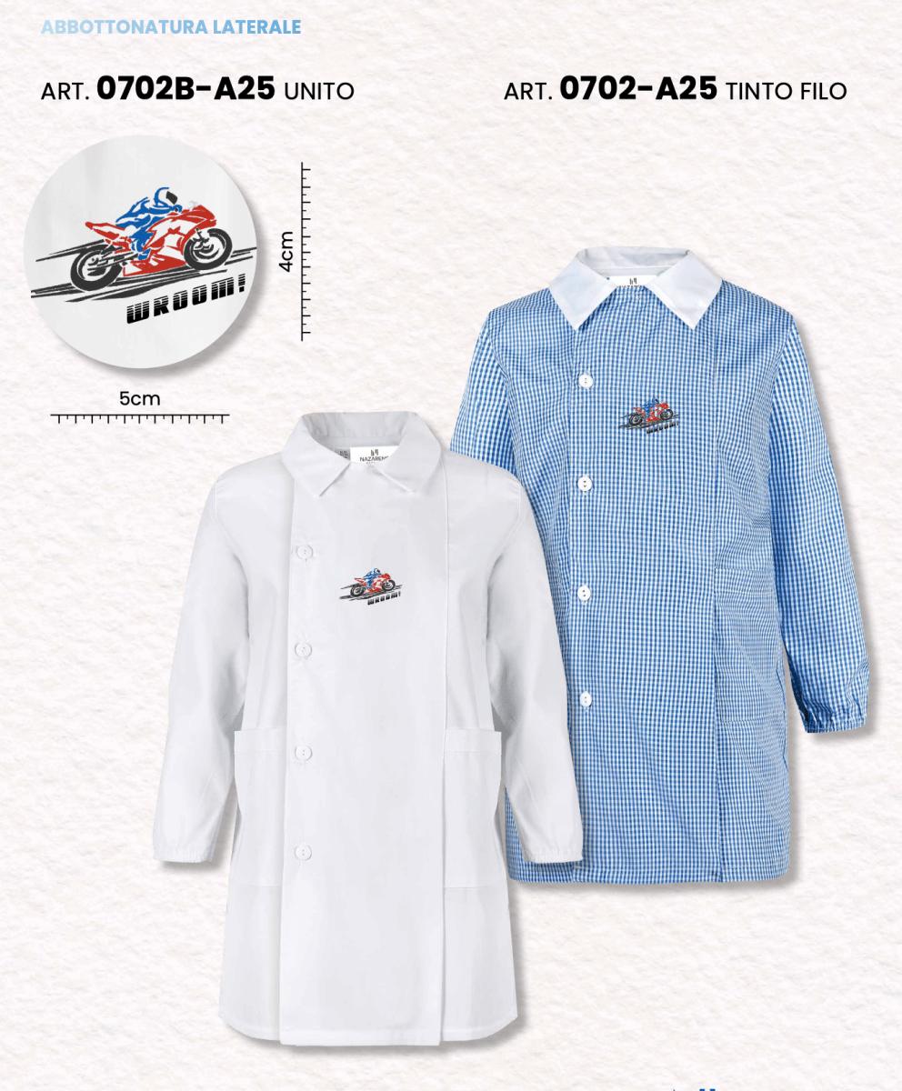 Grembiule Scuola Made in Italy – Asilo Bambino quadretti azzurri Nazareno Gabrielli ricamo Vroom 65% Poliestere, 35% Cotone Abbottonatura laterale con Bottoni Colletto bianco non rimovibile art. 0702