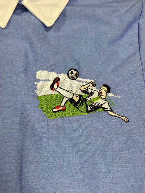 Grembiule scuola elementare bambino celeste con abbottonatura laterale ricamo Calcio MN904