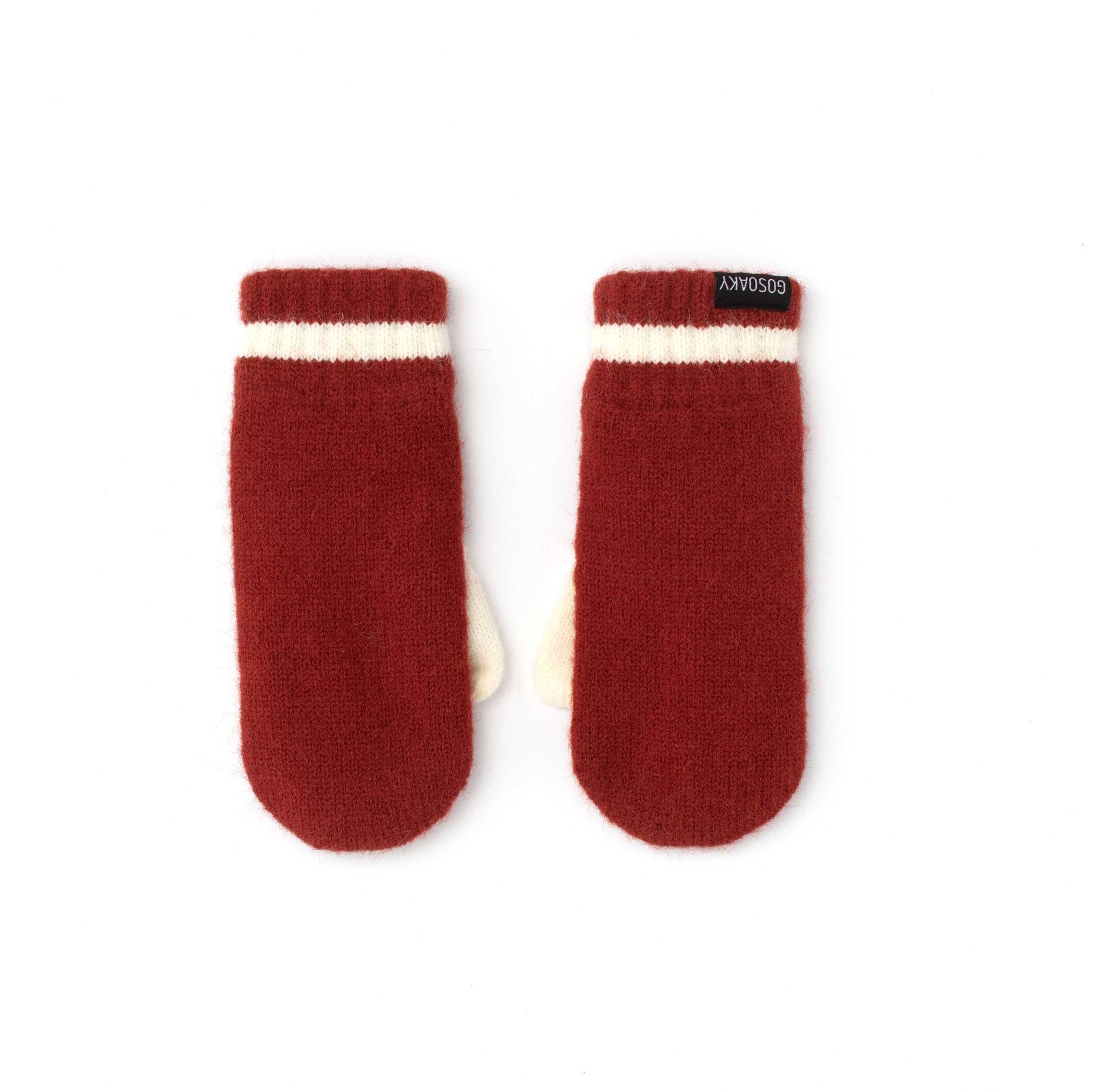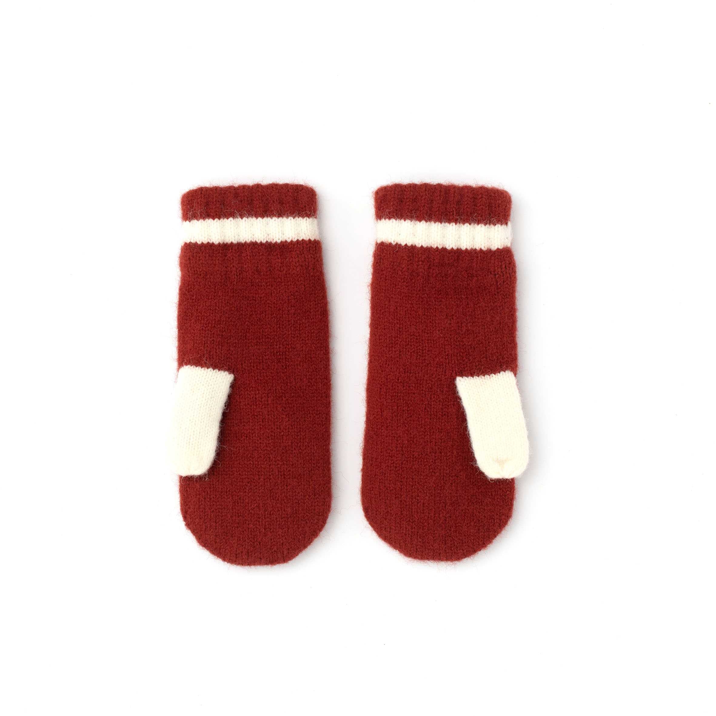 Comodi e caldi guanti bicolore, ruggine/bianco, in morbida maglia e foderati in pile.