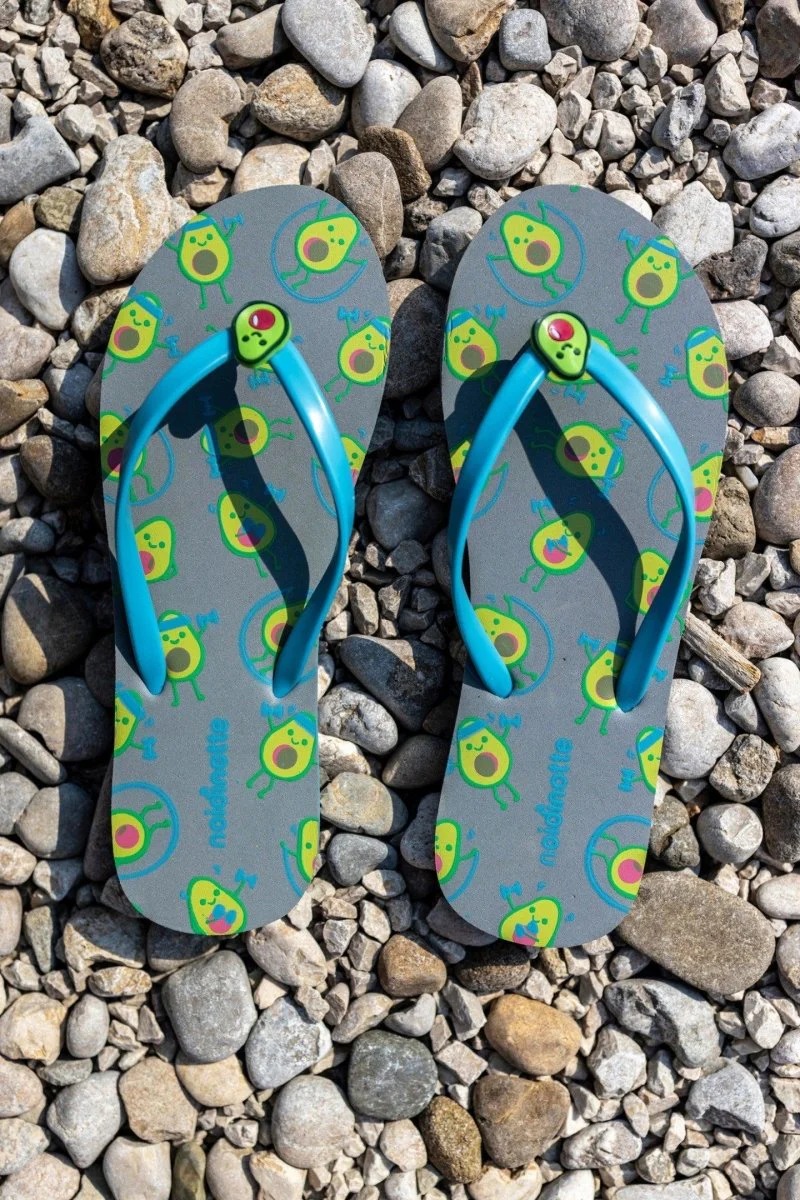 Infradito donna con stampa avocado sulla suola e cinturini con applicazione in gomma. Altezza suola: 2 cm Composizione Cinturini: 100% Pvc Composizione Suola: 100% Etilene Vinile Acetato art. PF2421AB