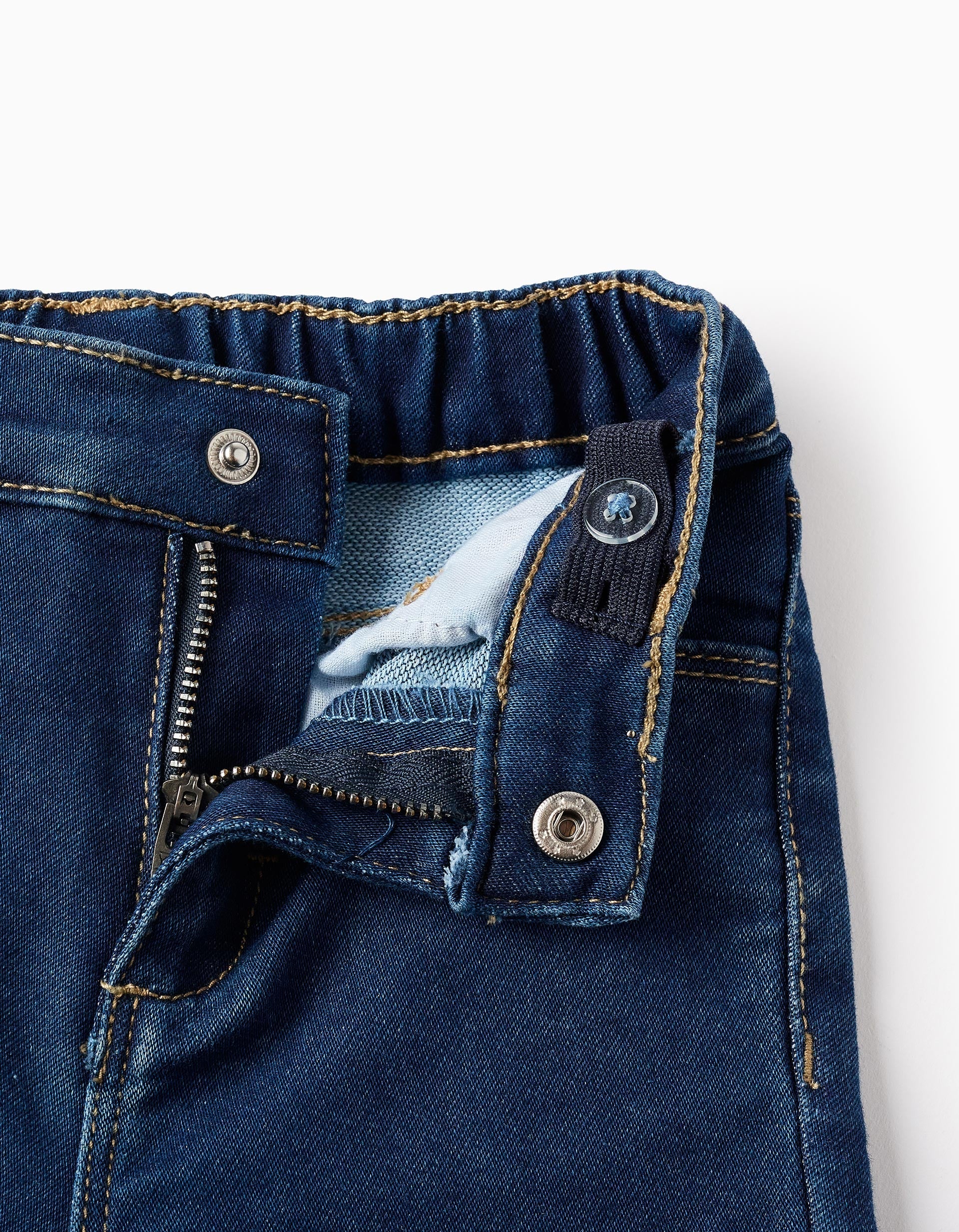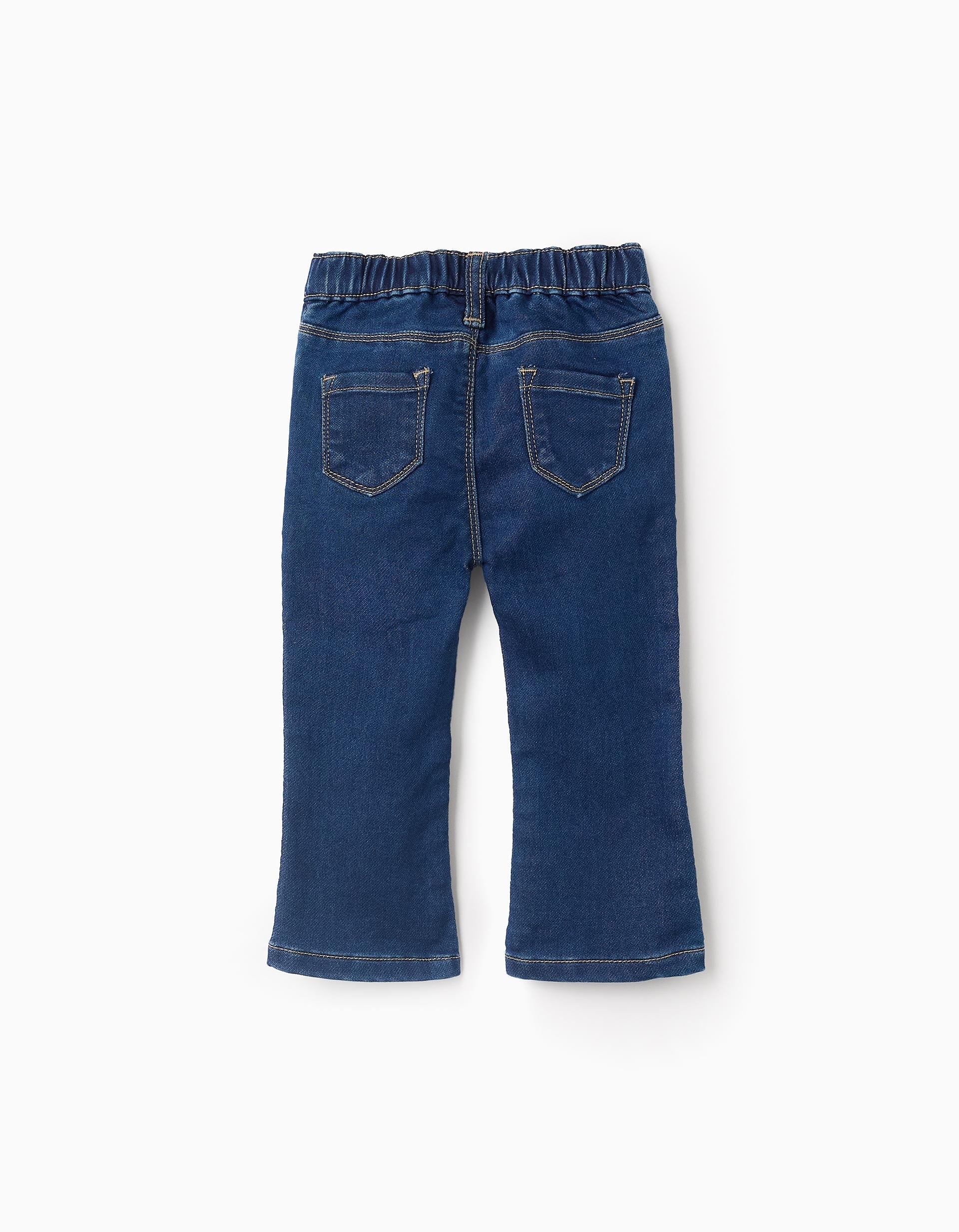Pantaloni denim svasati in cotone con un tocco di stretch per maggiore comfort e libertà di movimento. Chiusura con bottone, regolabili all’interno con elastici e bottoni. Cuciture gialle a contrasto. Un pantalone comodo e alla moda!