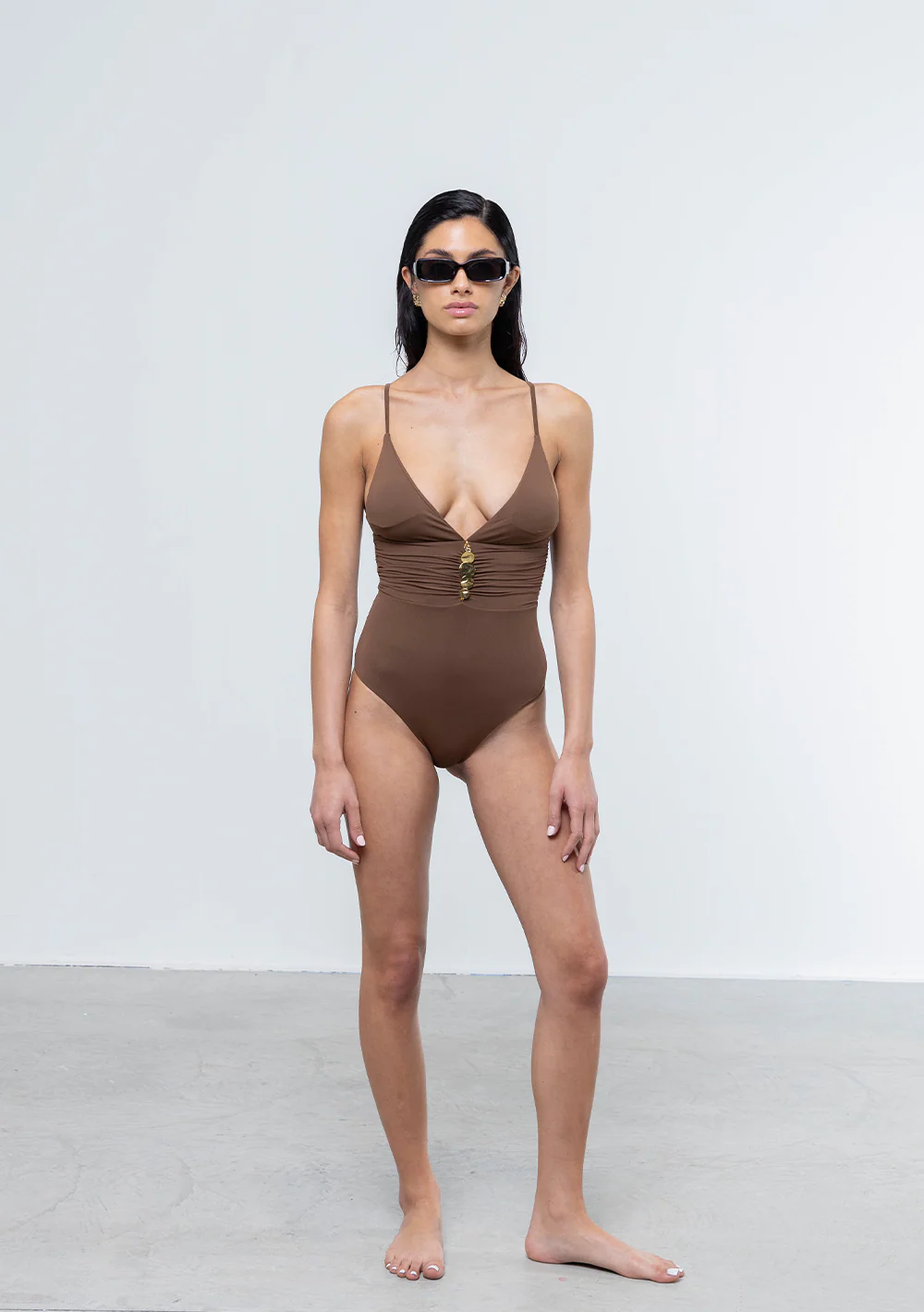 La profonda scollatura a V di questo costume intero valorizza il décolleté con un tocco di audacia. I dettagli dorati, posizionati al centro del busto, creano un punto luce che attira l’attenzione e slancia la figura. Il tessuto, morbido e avvolgente, accarezza la pelle e si adatta alle curve del corpo con delicatezza, garantendo una vestibilità impeccabile.