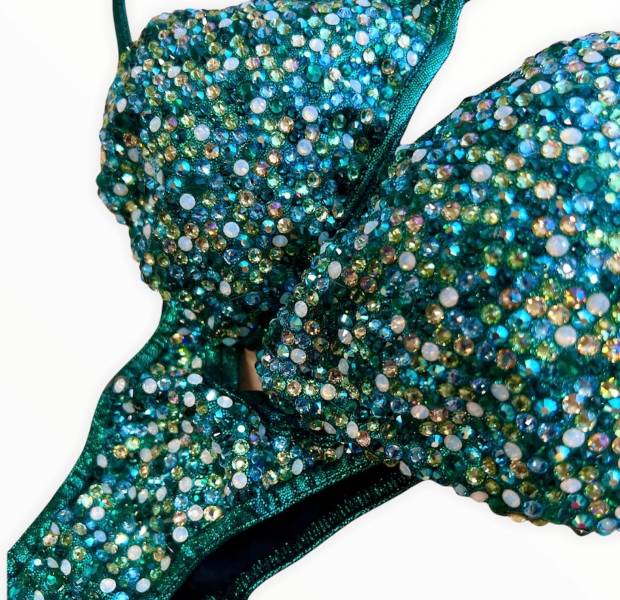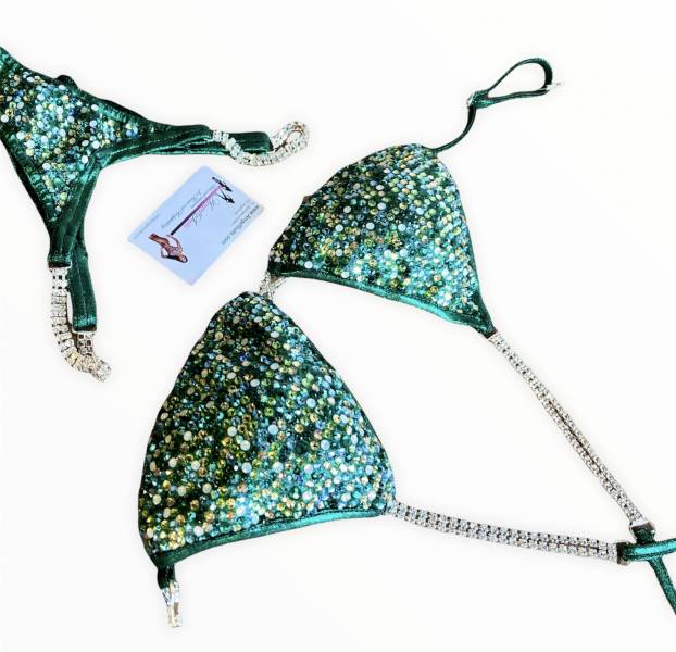 Bikini Luxury Forest green, tessuto verde scuro holo mist, triangolo imbottito slip PRO V frontale, decorazione FULL, multicolor multisize swarovski e con effetti AB e opaline , connettori ottagono centrale e catenine doppie, chiusura e regolatore laccetti in strass.