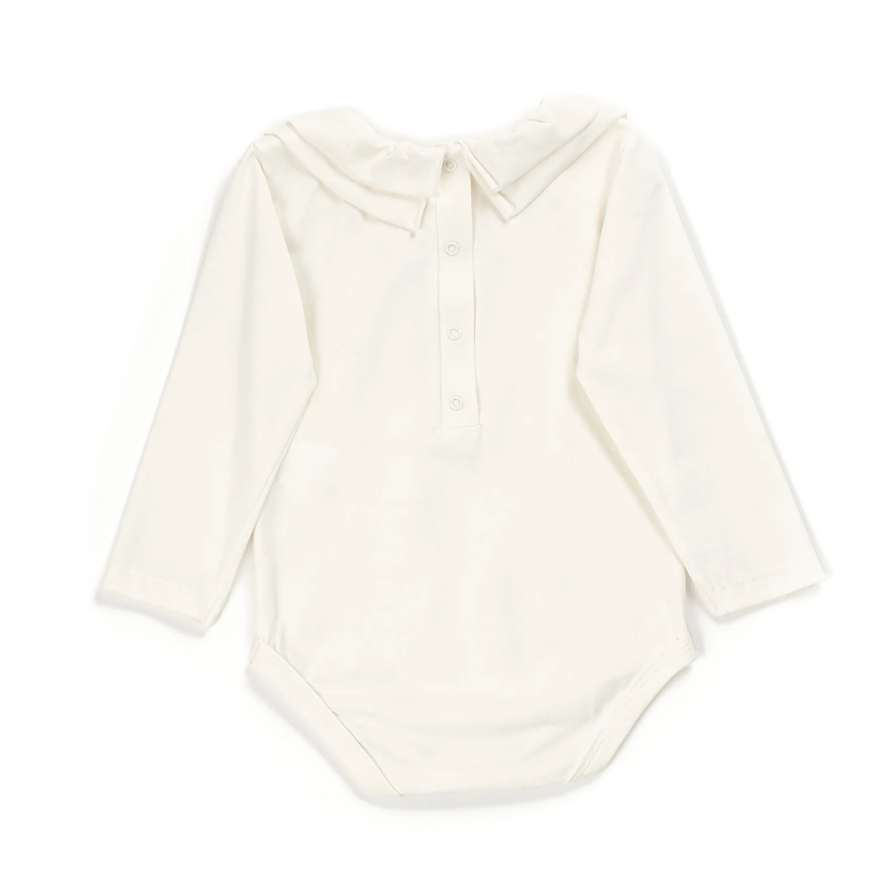 Body panna in cotone organico con collo a volant a taglio vivo e bottoni a clip sulla schiena e nella parte inferiore, pratici per il cambio.