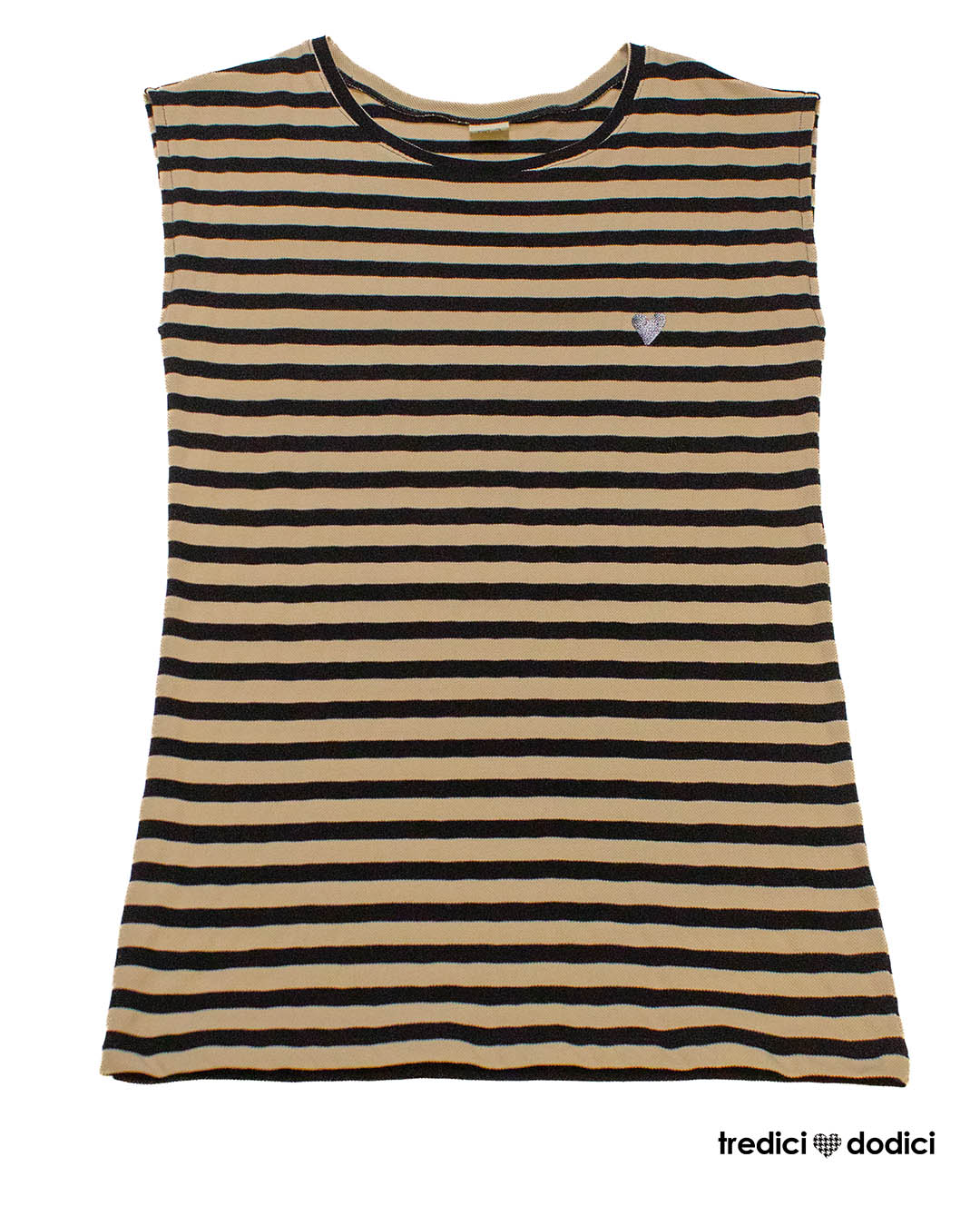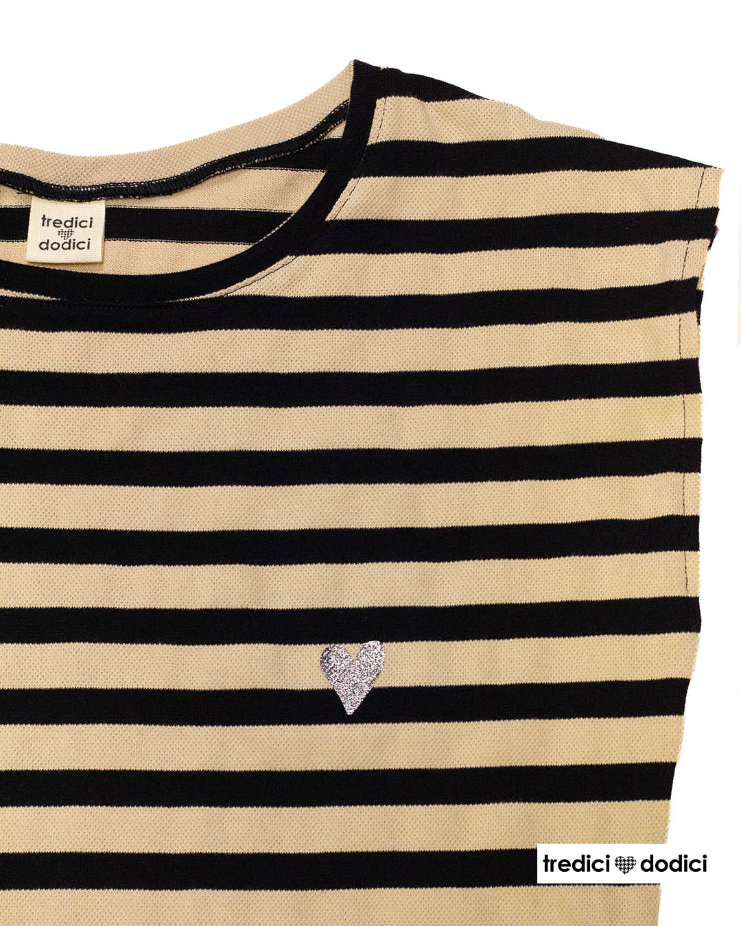 Mini abito donna in cotone a righe con cuoricino glitter stampato.