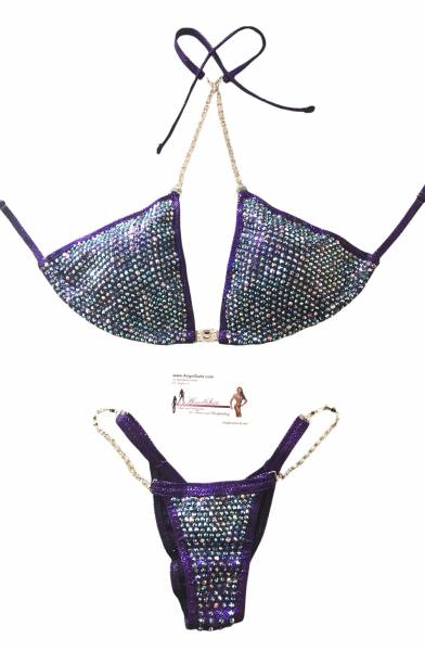 Bikini viola melanzana hologram full Swarovski crystal AB e 3 differenti toni AB, cat singole e ottagono centrale, coppetta push up inclusa .
