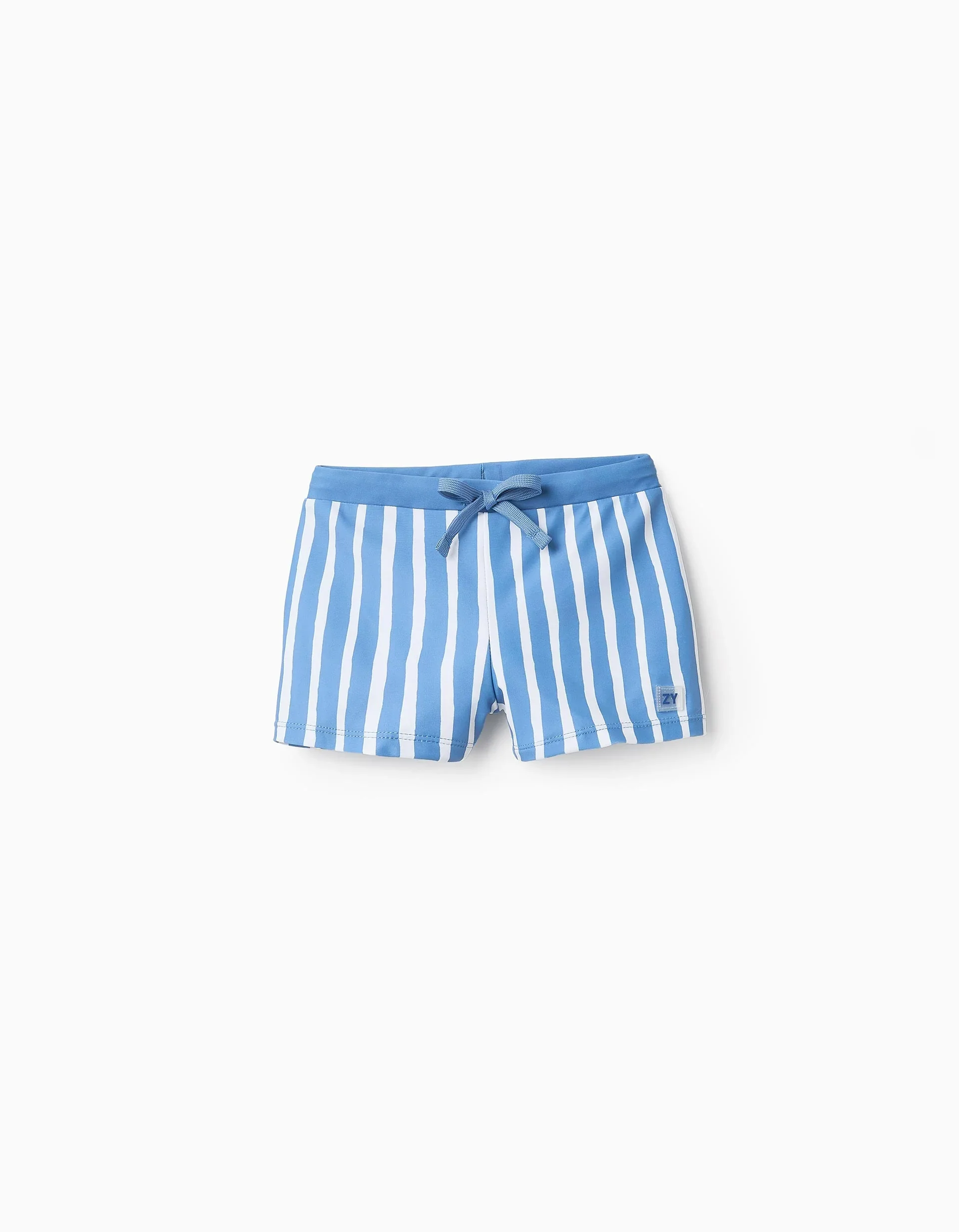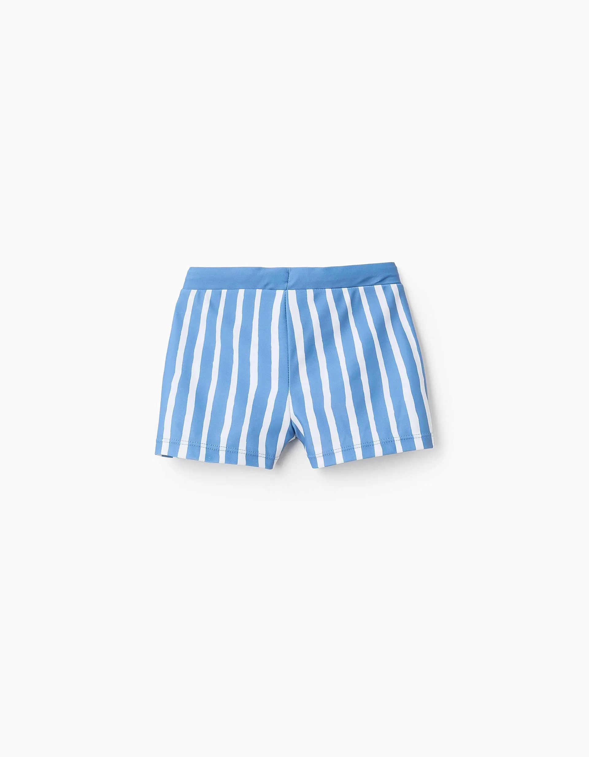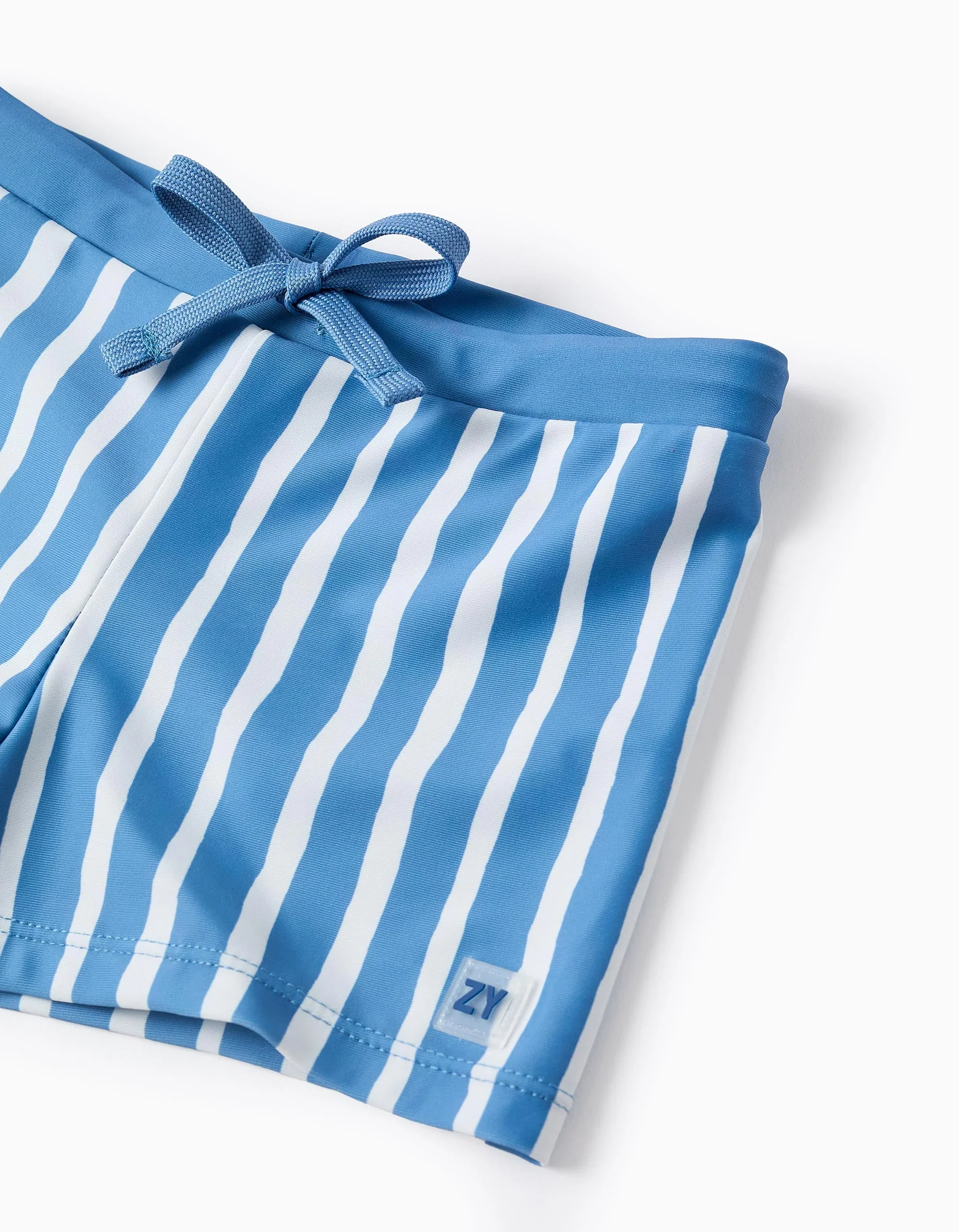 Pantaloncini da bagno per bambini, in nylon comodo e flessibile, con strisce blu e bianche. Vita comoda e flessibile con coulisse regolabile. Fodera in rete per il massimo comfort.