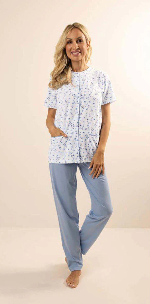 Pigiama aperto donna Jersey, maglia manica corta in microfantasia con abbottonatura centrale, con tasche, e pantalone lungo in tinta unita senza polsini della Gary.