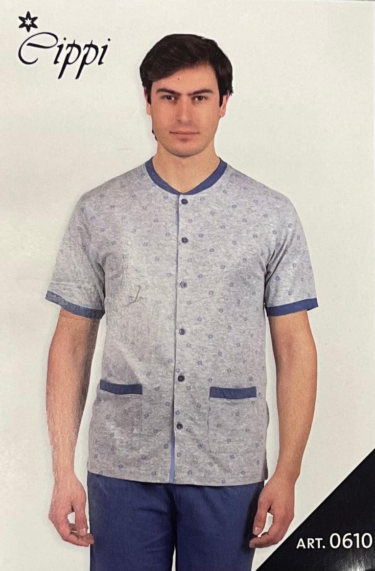 Pigiama uomo 100% cotone, composto da maglia manica corta con abbottonatura centrale in microfantasia, con tasconi e pantalone lungo senza polsini in tinta unita a contrasto di Cippi.