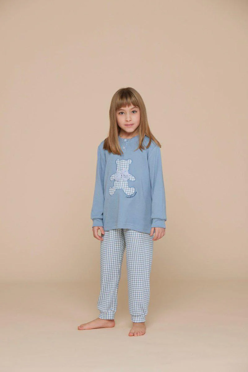 Pigiama serafino bambina in interlock di Noidinotte, maglia tinta unita con applicazione Orsetto e pantalone a quadrettini, il tutto con polsini.