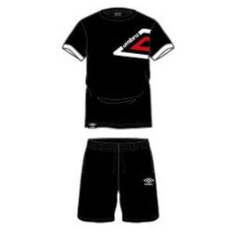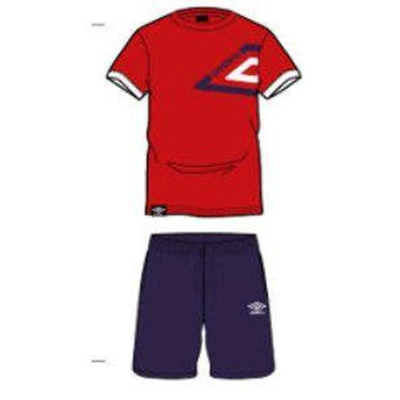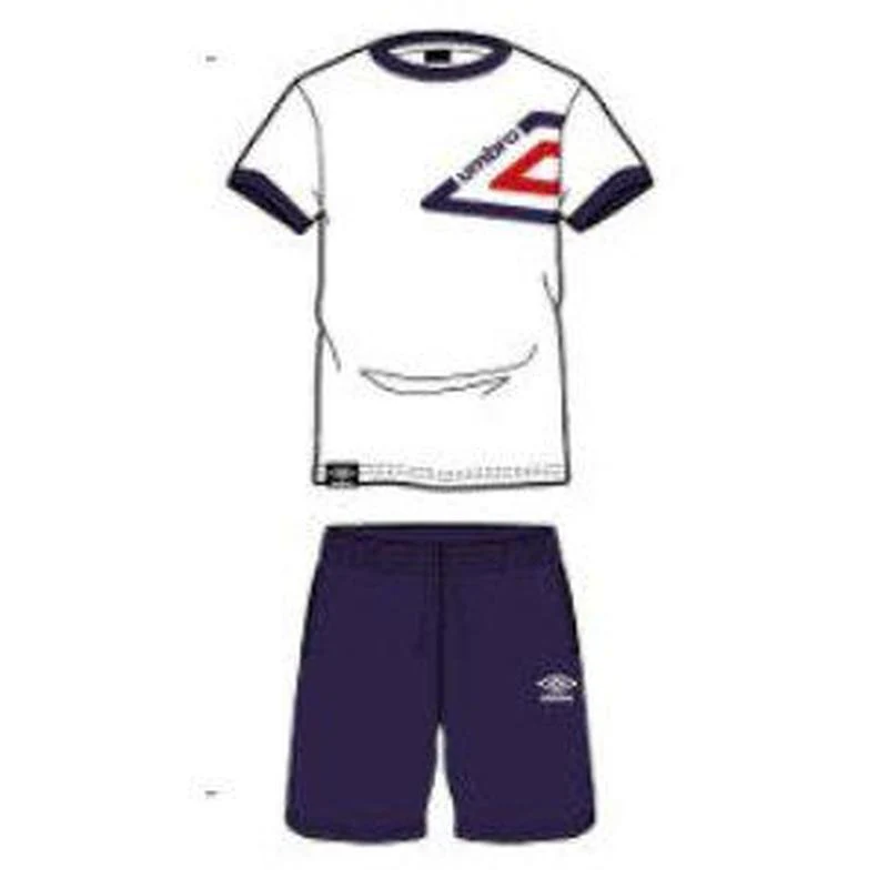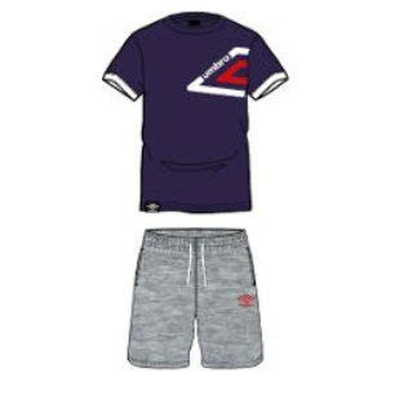 Completo ragazzo in puro cotone della linea Umbro, composto da maglia mezza manica con girocollo e pantaloncino corto a contrasto.
