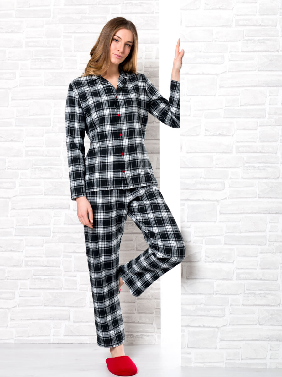Pigiama con collo a uomo. In tessuto scozzese, chiuso su tutta la lunghezza con bottoni a contrasto. Pantalone scozzese liscio rifinito nel fondo con due aghi.