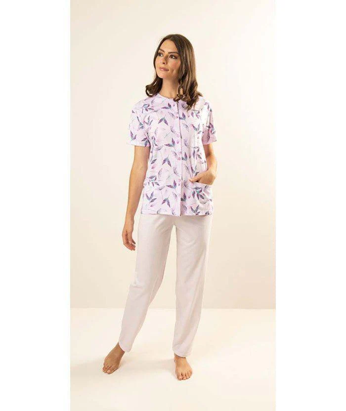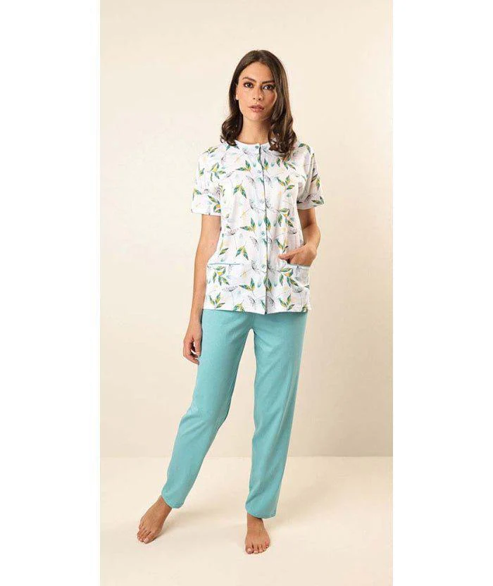 Pigiama aperto donna Jersey, maglia manica corta a fantasia con abbottonatura centrale e tasche, pantalone lungo in tinta unita senza polsini della Gary. Taglie calibrate Composizione: 100% Cotone art. Z50033CONF