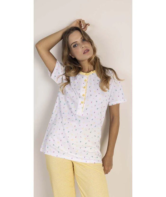 Pigiama serafino donna Jersey, maglia manica corta a fantasia con 5 bottoni e pantalone lungo microfantasia senza polsini della Gary.