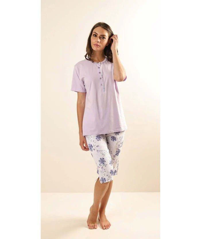 Pigiama serafino donna Jersey, maglia manica corta tinta unita con 5 bottoni e pantalone pinocchietto a fantasia della Gary.