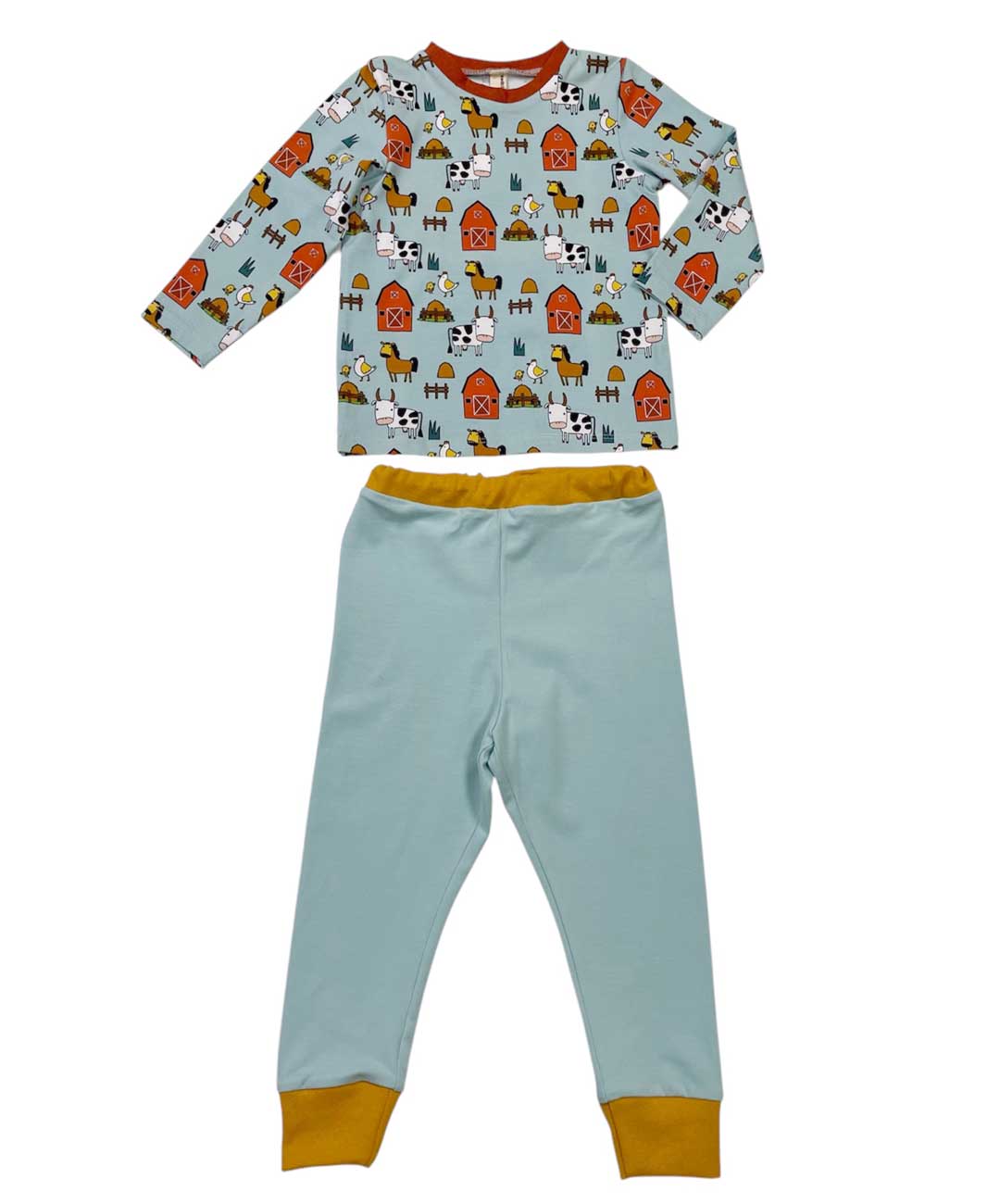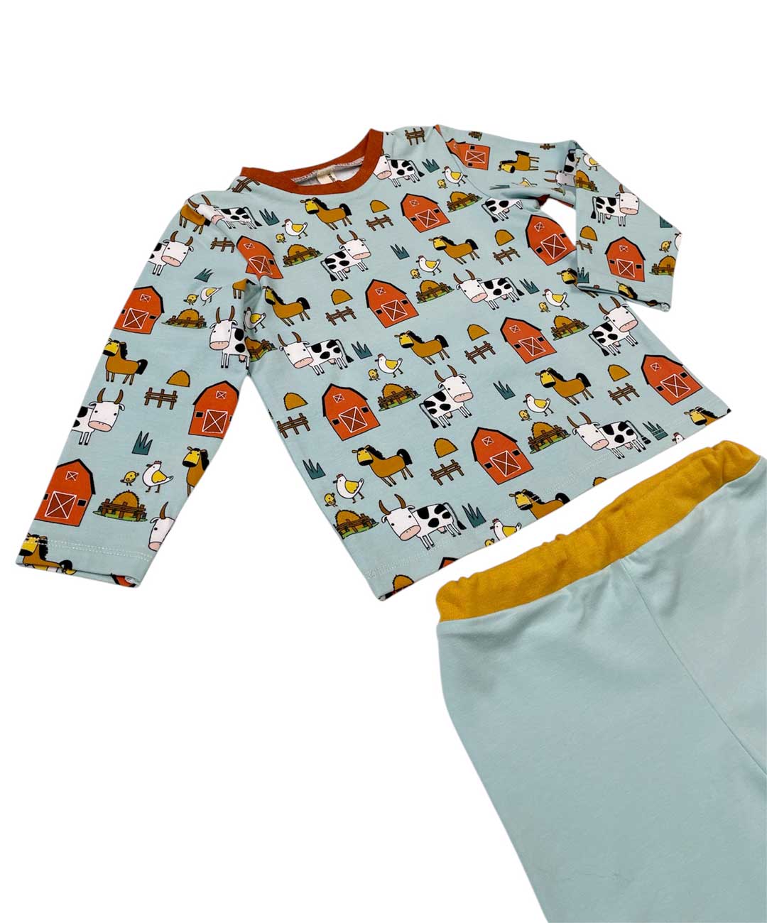 Pigiama bimbo in cotone fantasia fattoria con t-shirt e pantalone con polsino.