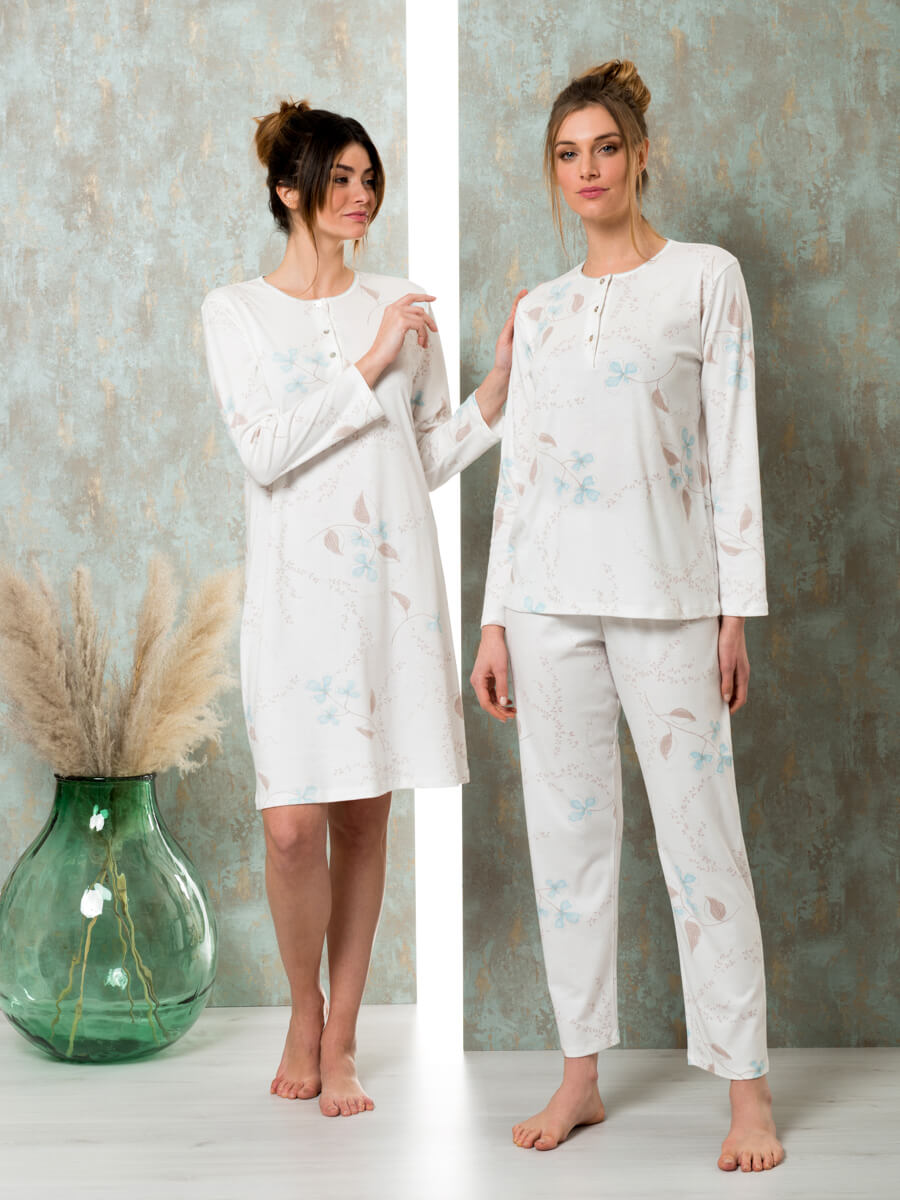 Pigiama girocollo chiuso con tre bottoni in madreperla. Pantalone lineare tutto in una delicata fantasia floreale. Disponibile in panna e laguna.