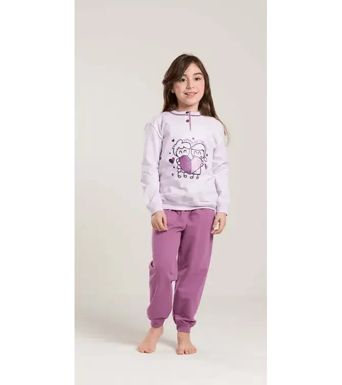 Pigiama bambina in felpa maglia stampata con 2 bottoni e pantalone tinta unita a contrasto con polsini. Composizione: 100% cotone felpato art. V20038