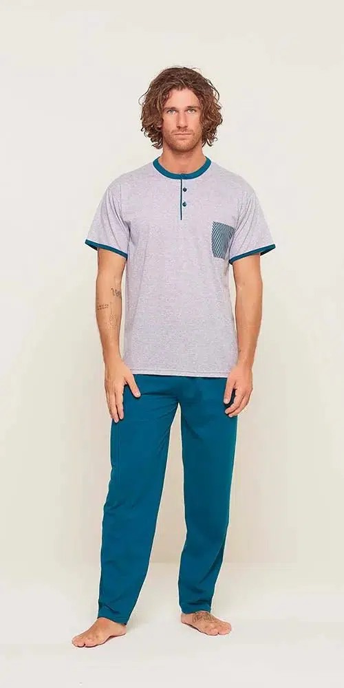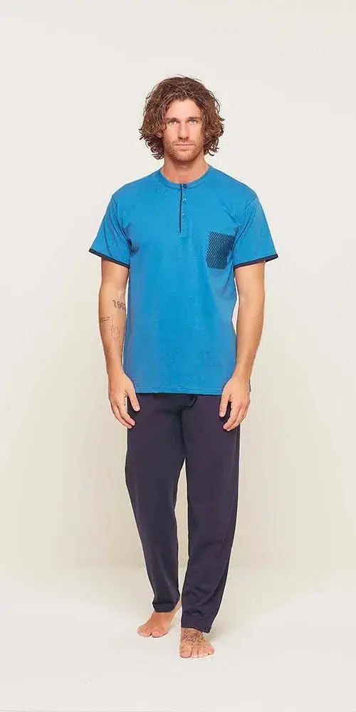Pigiama uomo serafino con 3 bottoni in puro cotone della Gary, composto da maglia manica corta e pantalone lungo, il tutto in tinta unita e senza polsini.