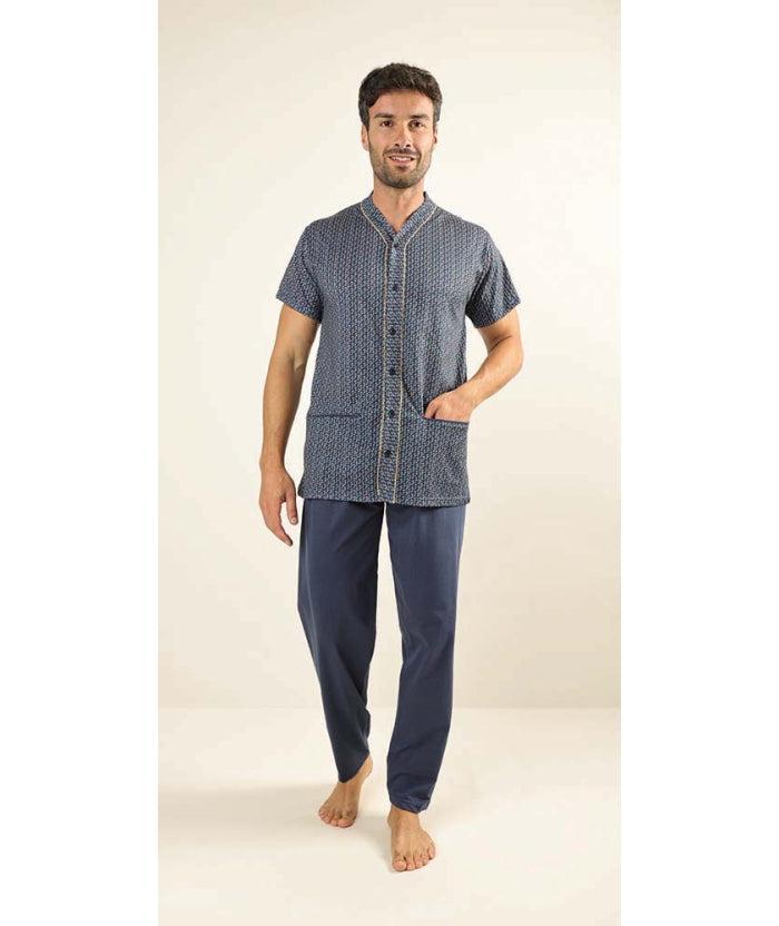 Pigiama uomo aperto Jersey, maglia manica corta con abbottonatura centrale in microfantasia e pantalone lungo in tinta unita, il tutto senza polsini della Gary.