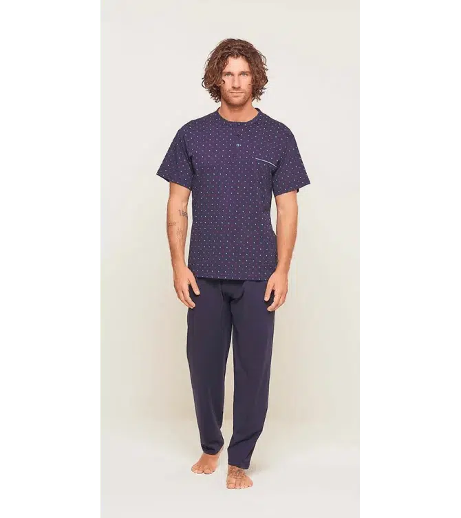 Pigiama uomo serafino con 3 bottoni Jersey manica corta in microfantasia e pantalone lungo in tinta unita, il tutto senza polsini della Gary. Composizione: 100% Cotone art. U60004