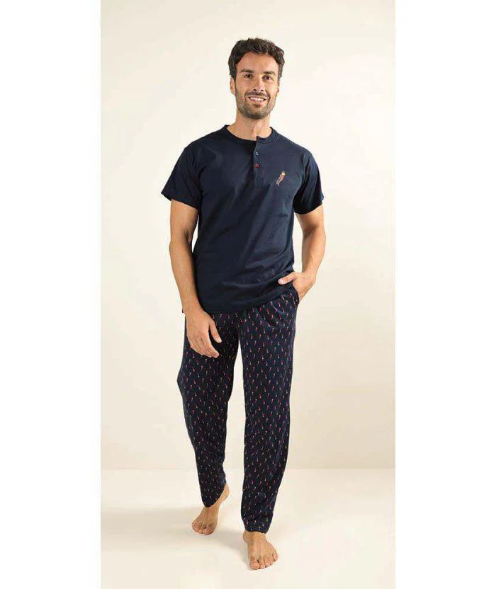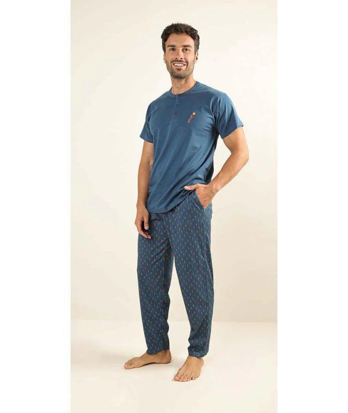 Pigiama uomo serafino con 3 bottoni Jersey manica corta in tinta unita e pantalone lungo a fantasia, il tutto senza polsini della Gary.