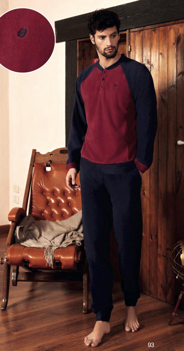 Pigiama uomo serafino con 3 bottoni in pile, maglia e pantalone in tinta unita di Nottingham, il tutto con polsini. Composizione: 100% Poliestere art. PG41881