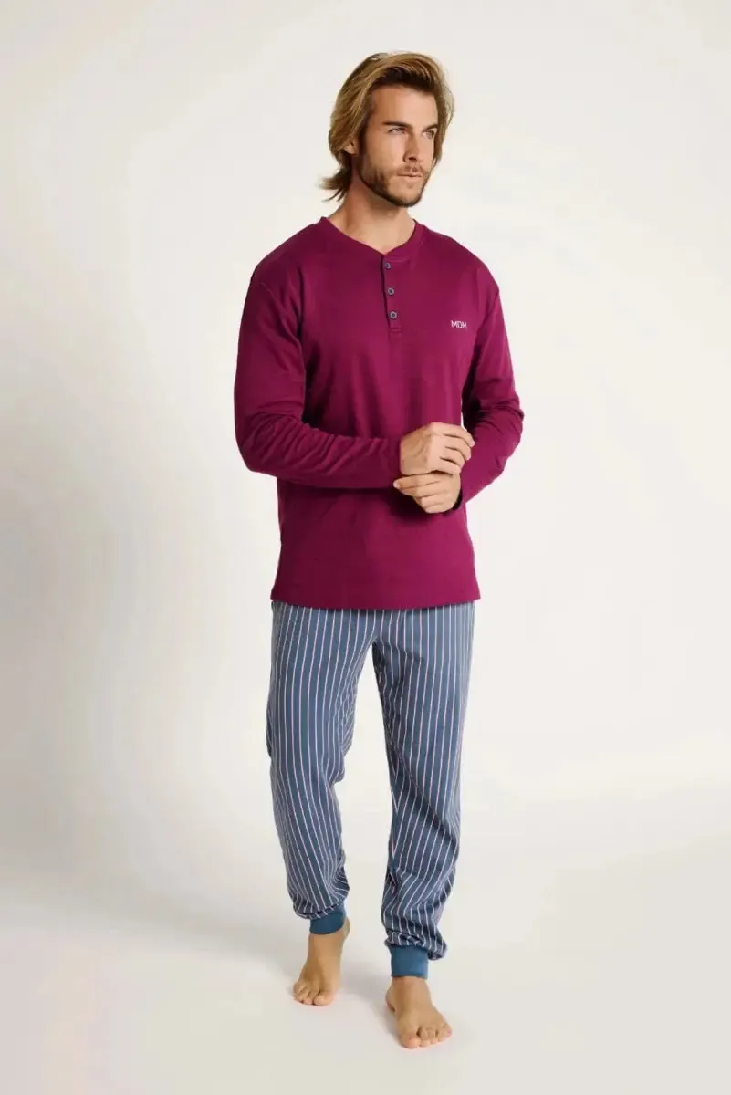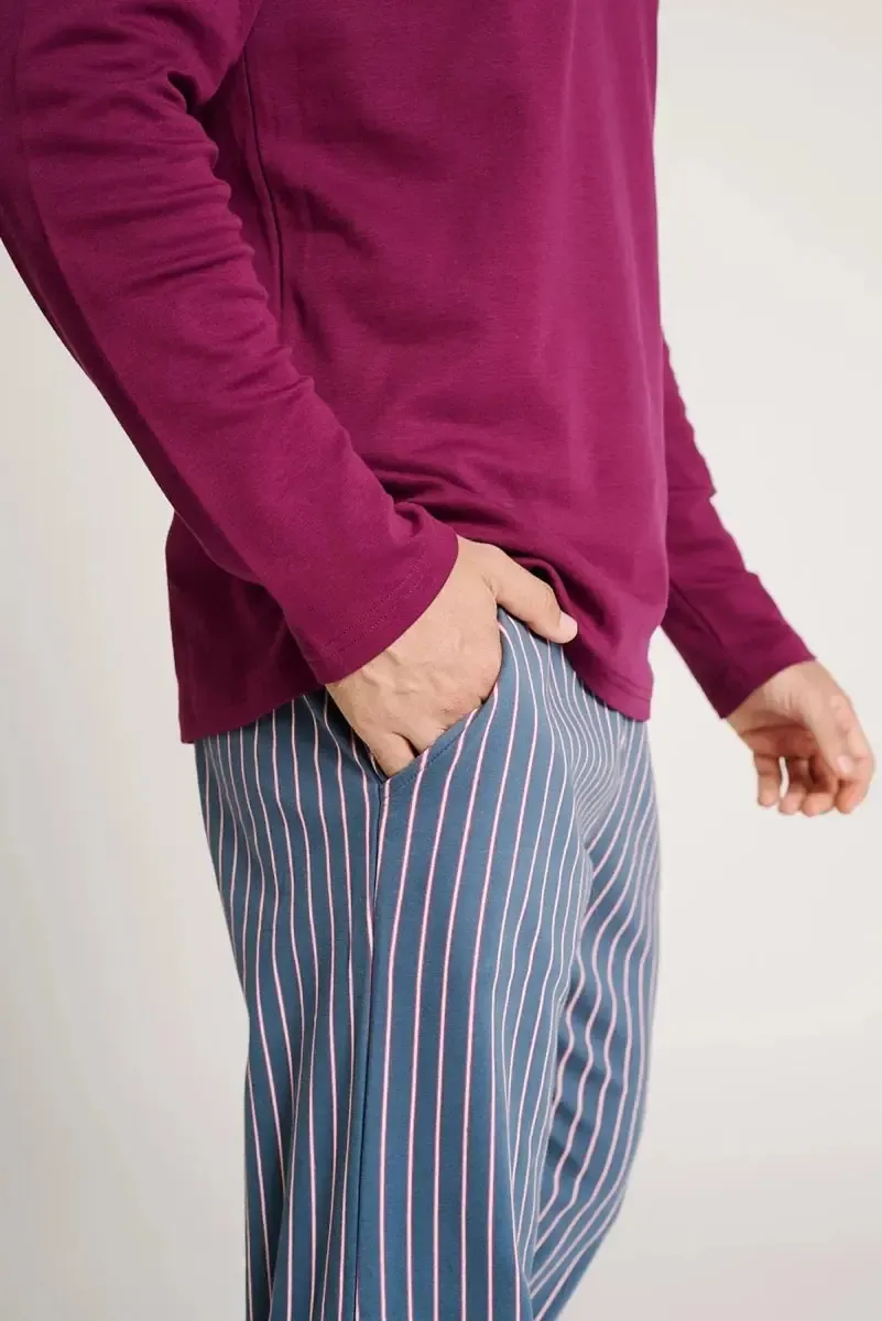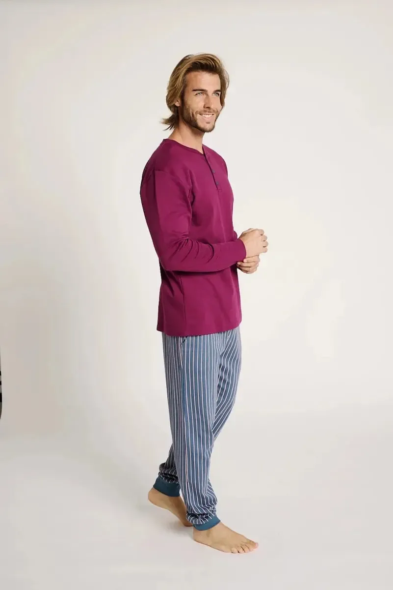 Pigiama lungo da uomo combina una semplice t-shirt bordeaux con colletto button-down e pantaloni lunghi a righe con polsini, ideali per notti di riposo.
