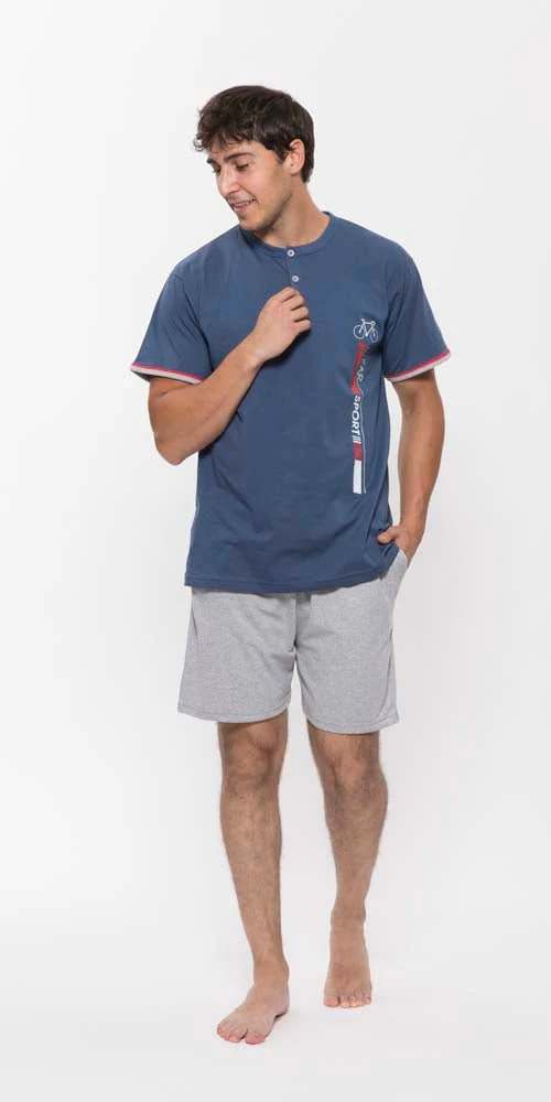 Pigiama uomo serafino con 3 bottoni in puro cotone della Gary, composto da maglia manica corta in tinta unita e pantalone corto a contrasto con tasche.