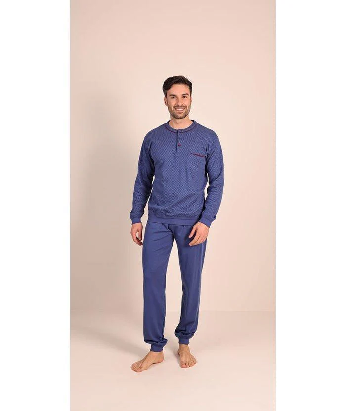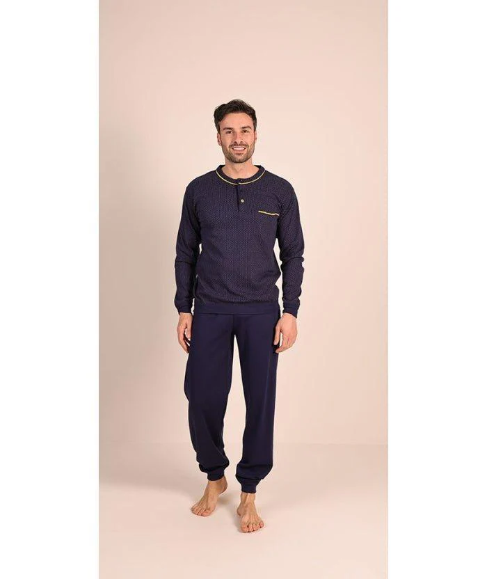 Pigiama uomo in caldo cotone serafino con 3 bottoni, maglia microfantasia e pantalone tinta unita con polsini. Composizione: 100% cotone interlock art. 6054