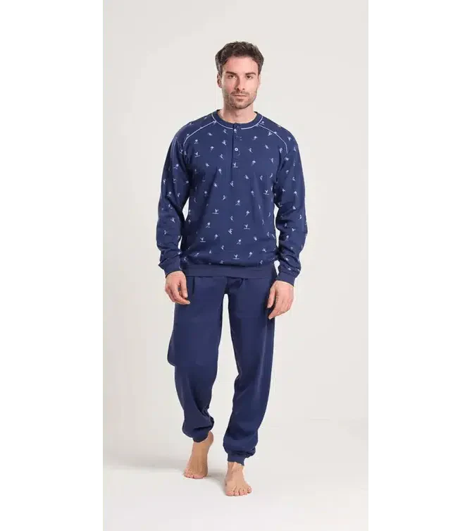 Pigiama uomo in caldo cotone serafino con 3 bottoni, maglia microfantasia e pantalone in tinta unita a contrasto, con polsini. Composizione: 100% cotone interlock art. V60010