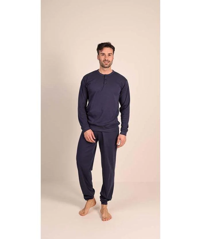 Pigiama uomo in caldo cotone serafino con 3 bottoni, maglia e pantalone in tinta unita completamente blu, con polsini.