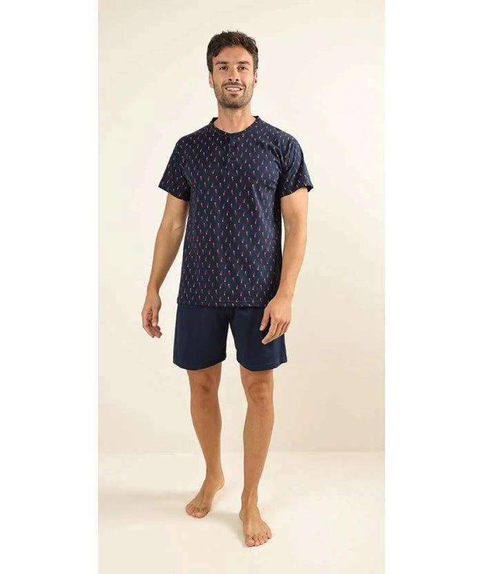 Pigiama uomo Jersey, maglia serafino con 3 bottoni a fantasia e pantaloncino tinta unita di Gary in puro cotone.
