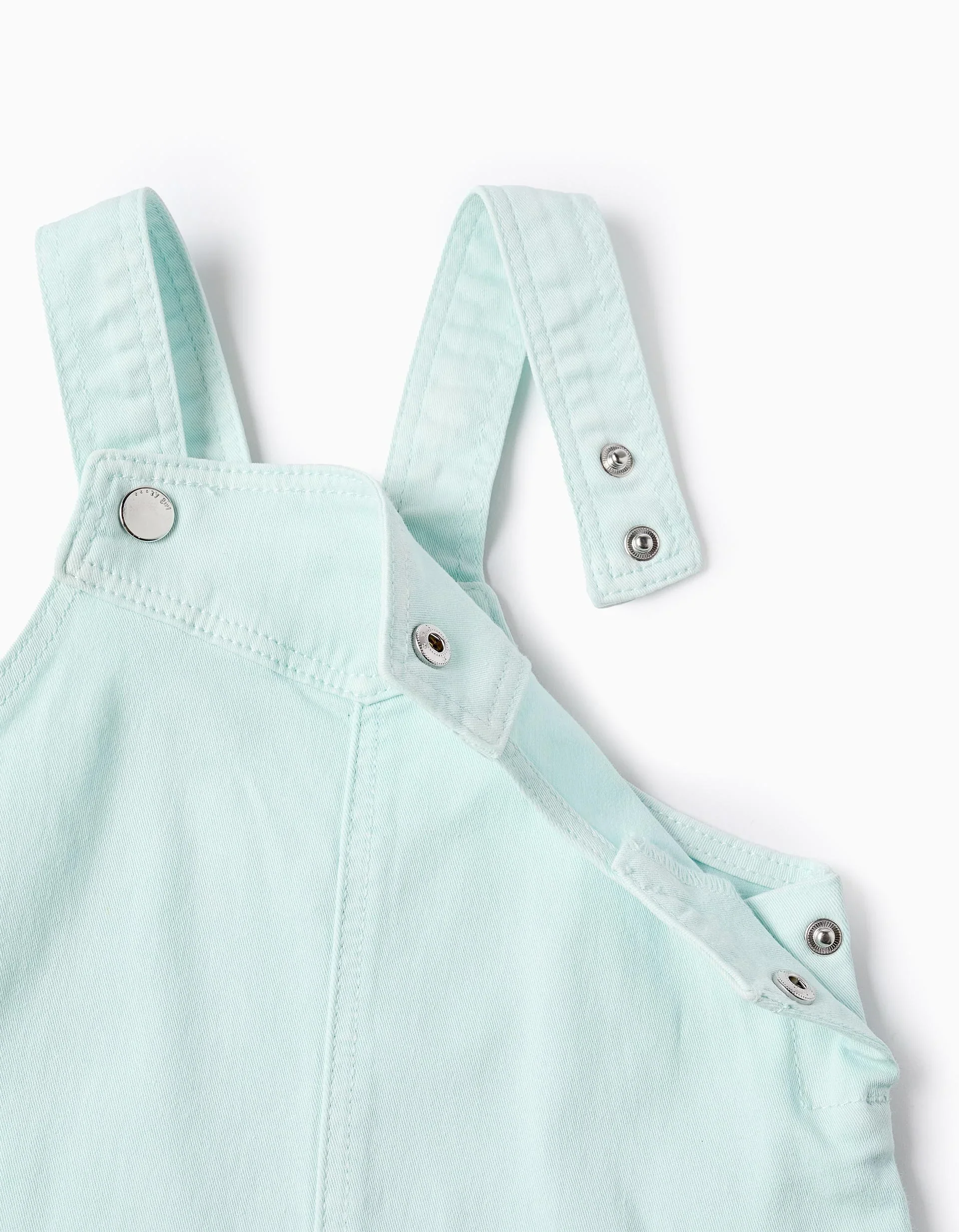 Vestito scamiciato in twill azzurro chiaro per neonate. Spalline regolabili. Bottoni automatici laterali. Tasche laterali.