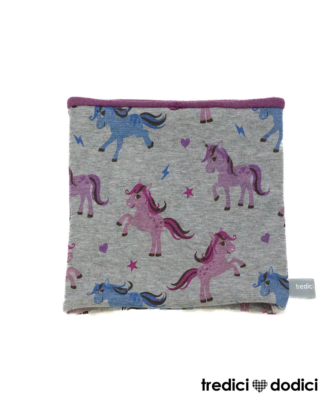 Scaldacollo double face in felpa invernale fantasia unicorni doppiato col caldo cotone, il tessuto invernale per i bimbi che non pizzica e non da allergie.
