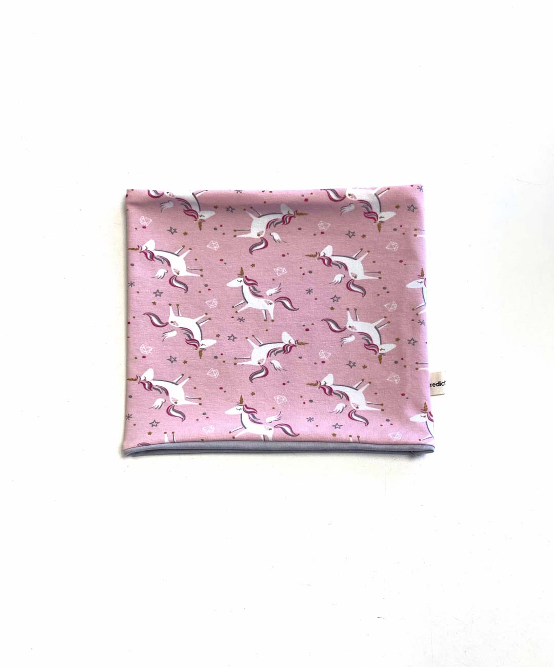 Scaldacollo in cotone con stampa unicorni con interno tinta unita abbinato.