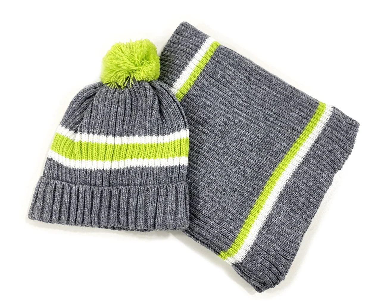 Set Bimbo scaldacollo e cappello in tessuto pesante con righe e pon pon; collo con pelliccia interna.