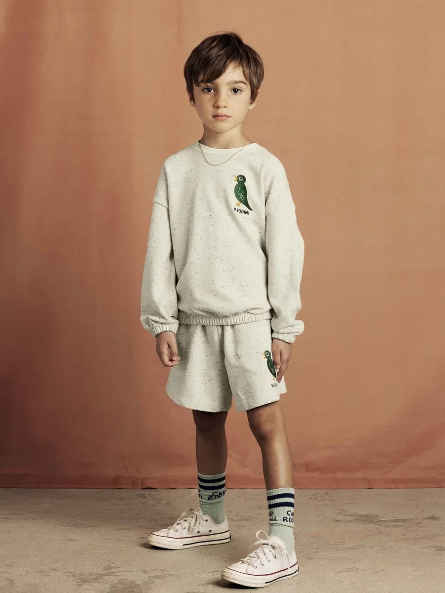 Morbidi pantaloncini della tuta realizzati al 100% in cotone biologico certificato GOTS, con un effetto mélange all over e un dettaglio di uccellino ricamato sul davanti. Progettato con una vita elastica con coulisse per una vestibilità comoda e tasche laterali per la praticità.