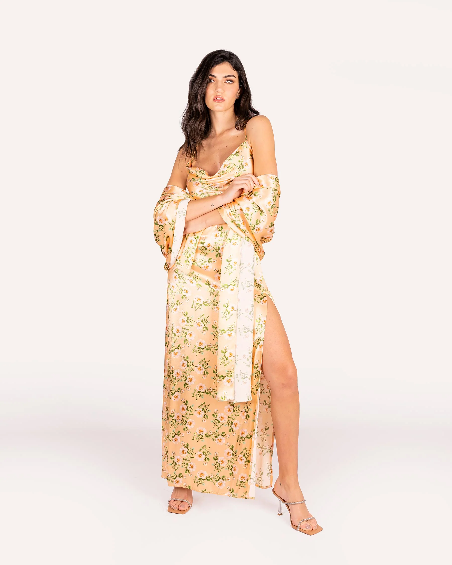 - Il tessuto è morbido e lucente: si tratta di un raso di viscosa e rayon. La viscosa viene prodotta dalla polpa di legno degli alberi. Attraverso un processo chimico, la polpa si trasforma in una massa densa dalla consistenza simile a quella del miele, appunto viscosa. Il raso di viscosa unisce le qualità del cotone e della seta. Da un lato è morbido, lucente e delicato sulla pelle come la seta, motivo per cui il tessuto è noto anche come seta artificiale. Dall’altro, è altrettanto resistente, traspirante e assorbente come il cotone
