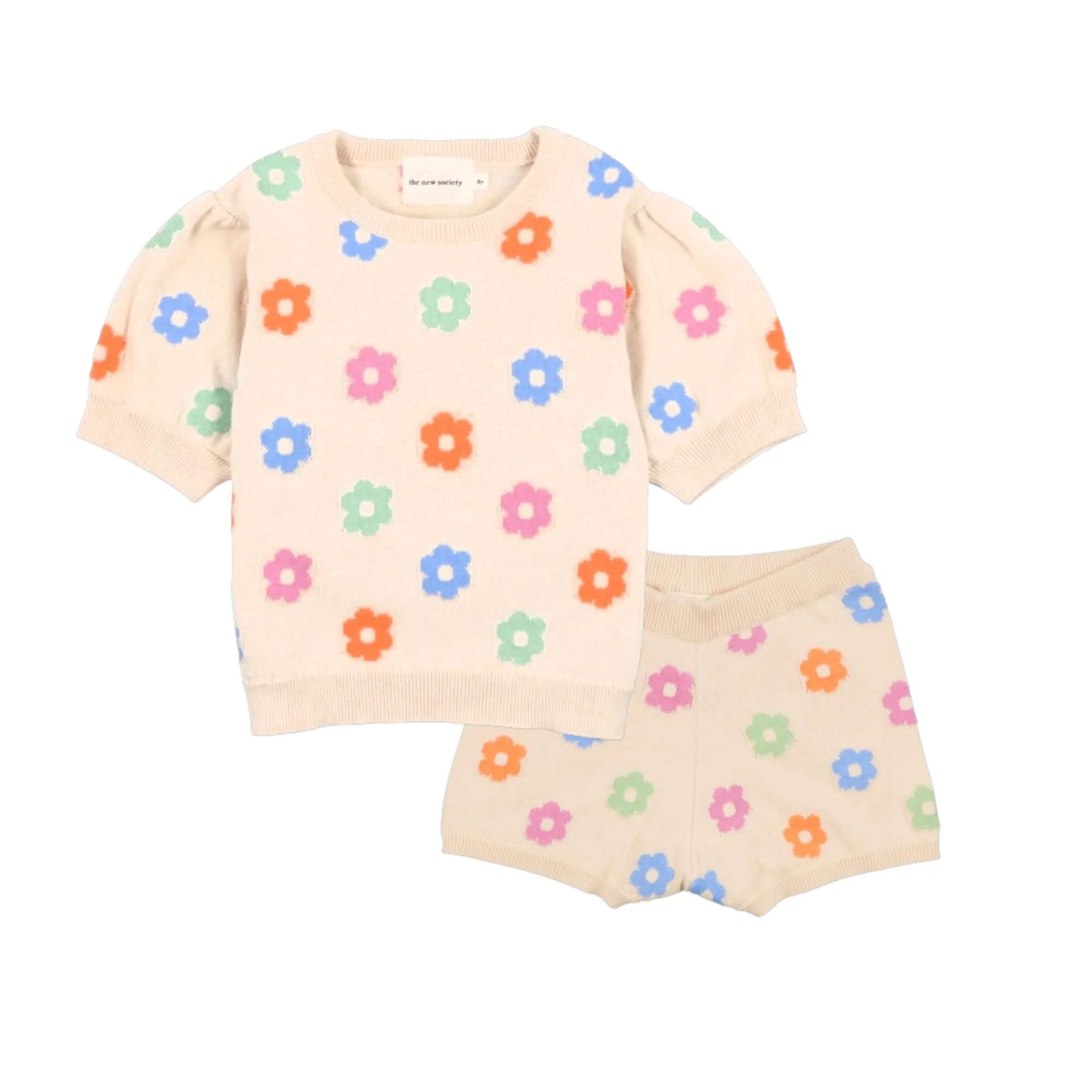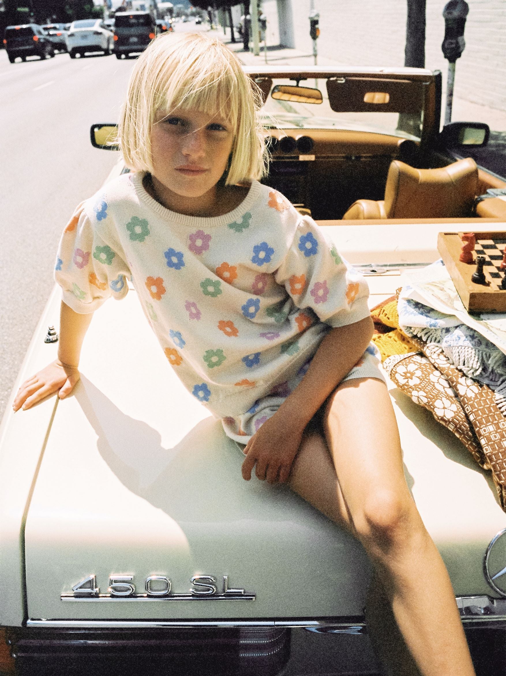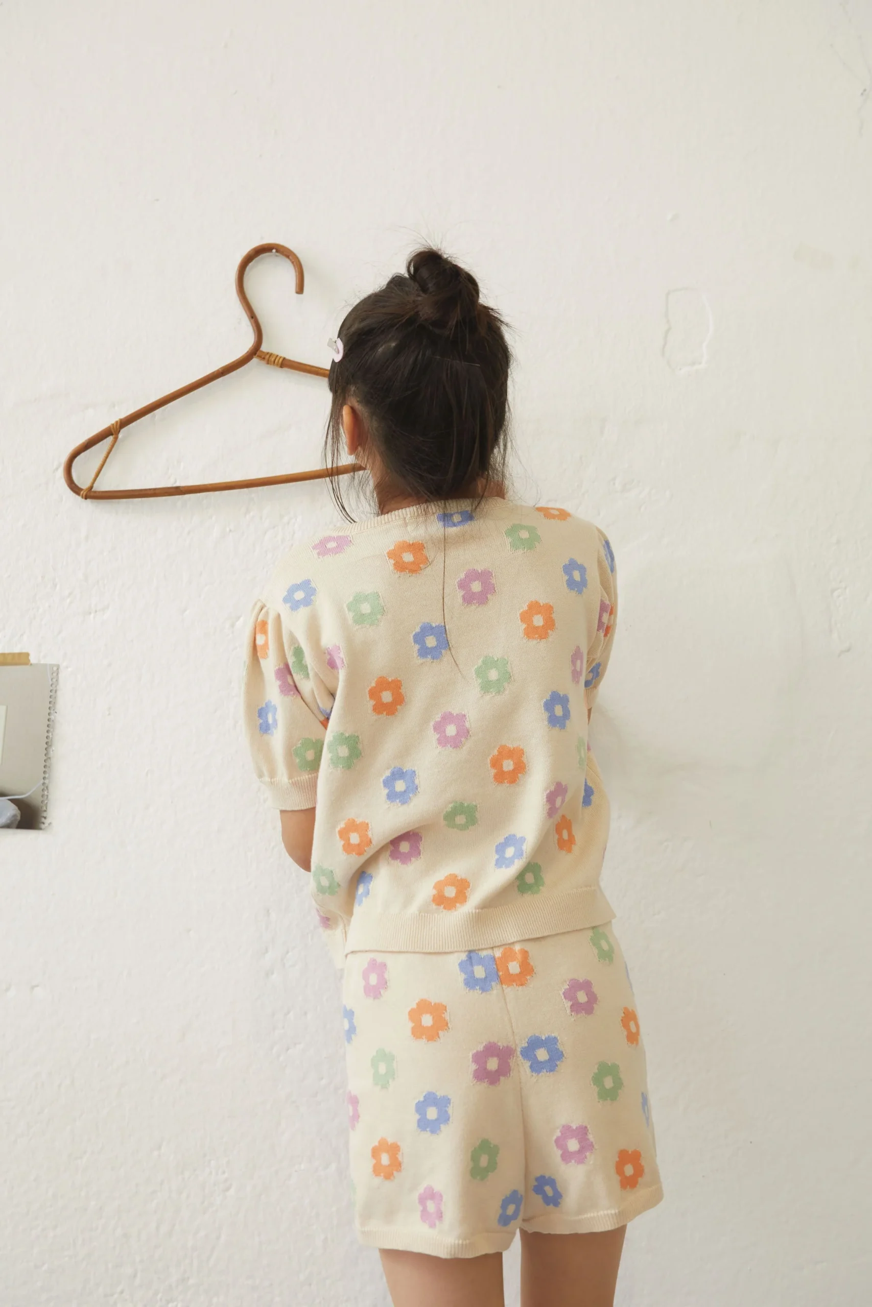 Il completo bambina T-shirt e pantaloncino Kent รจ composto da una t-shirt girocollo a manica corta e un pantaloncino, entrambi realizzati in morbida maglia di 100% cotone biologico con delicati intarsi a margherite. Ideale per un look fresco ed estivo, garantendo il massimo comfort grazie al tessuto naturale.