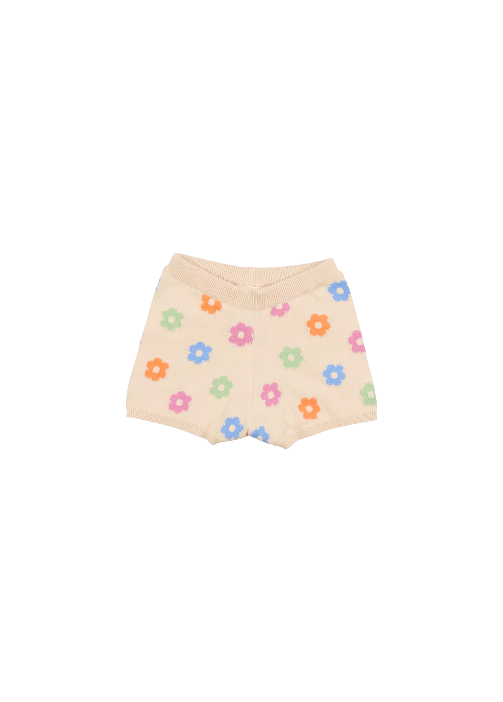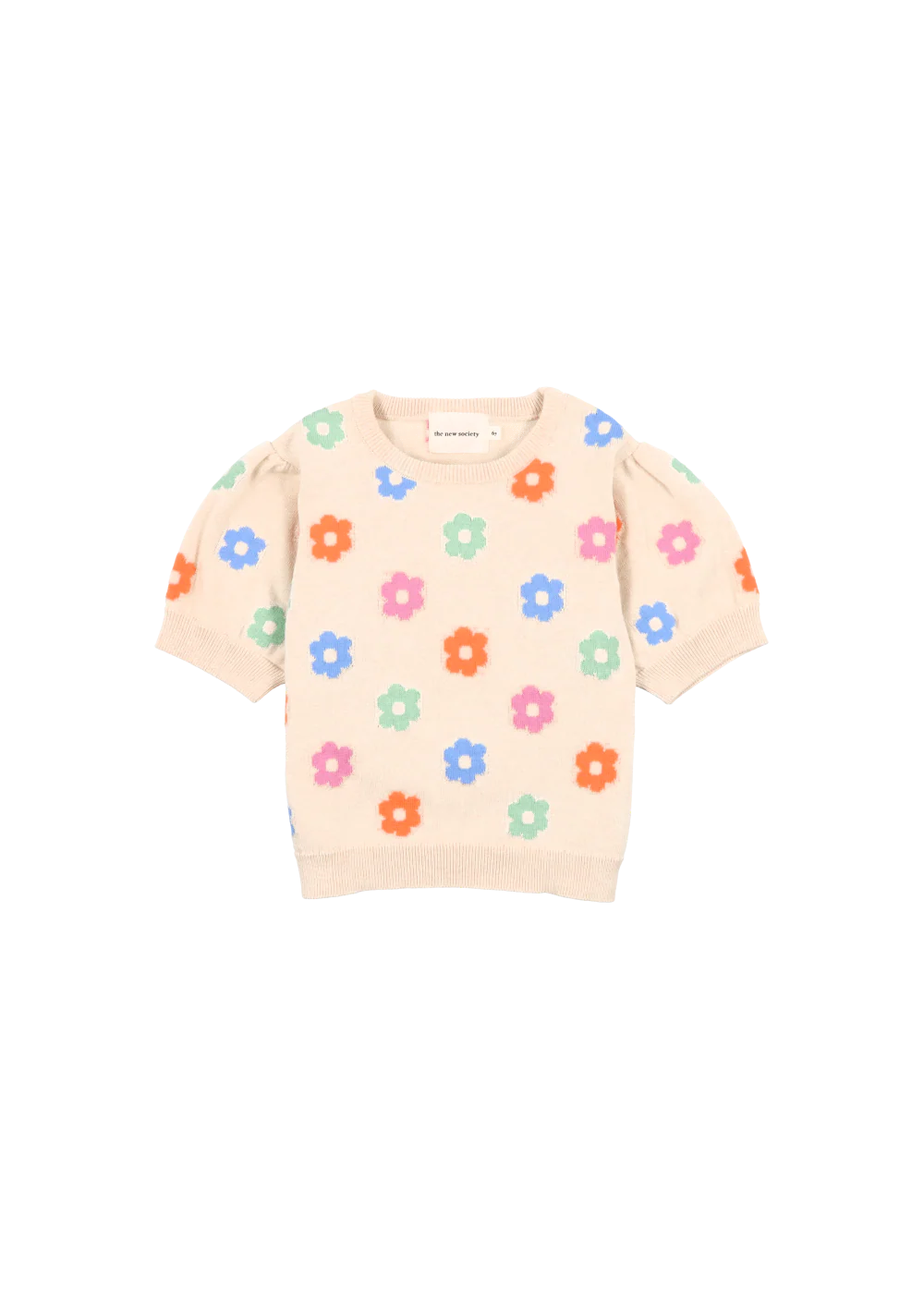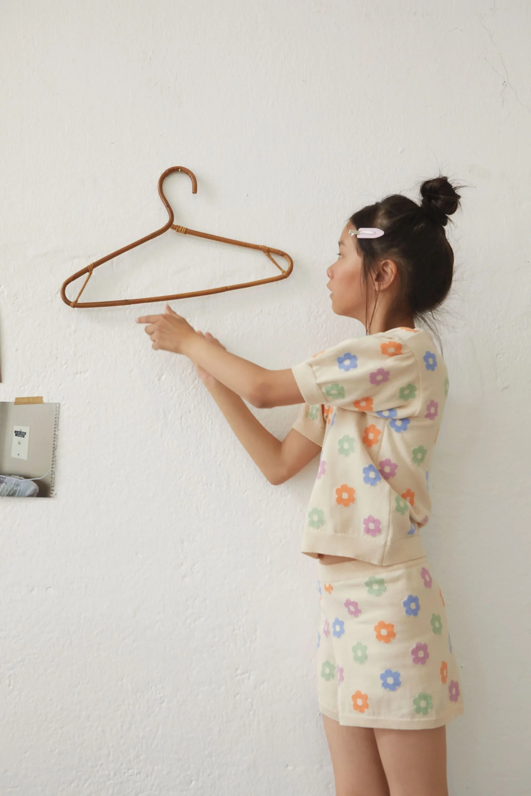 Il completo bambina T-shirt e pantaloncino Kent รจ composto da una t-shirt girocollo a manica corta e un pantaloncino, entrambi realizzati in morbida maglia di 100% cotone biologico con delicati intarsi a margherite. Ideale per un look fresco ed estivo, garantendo il massimo comfort grazie al tessuto naturale.