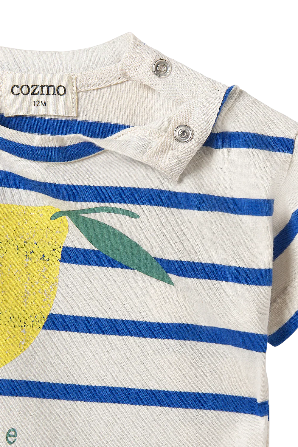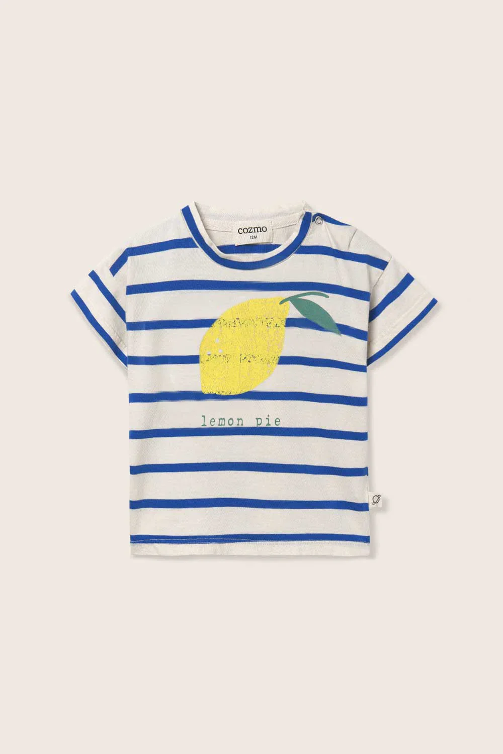 T-shirt a righe per neonati e bambini in jersey di cotone liscio e traspirante. Presenta una scollatura rotonda con bottoni automatici sulla spalla per una facile vestizione, maniche corte e un motivo stampato con un limone e il messaggio “Lemon pie”.