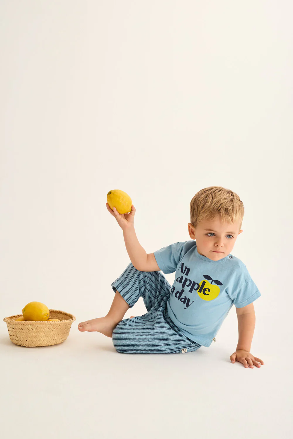 T-shirt per neonati e bambini in cotone fiammato molto leggero. Presenta una scollatura rotonda con bottoni automatici sulla spalla, maniche corte e un motivo stampato con una mela e il messaggio “una mela al giorno”. Realizzato in 100% cotone BCI e certificato OEKO-TEX. composizione: 100% cotone organico Realizzato a Barcellona, Spagna