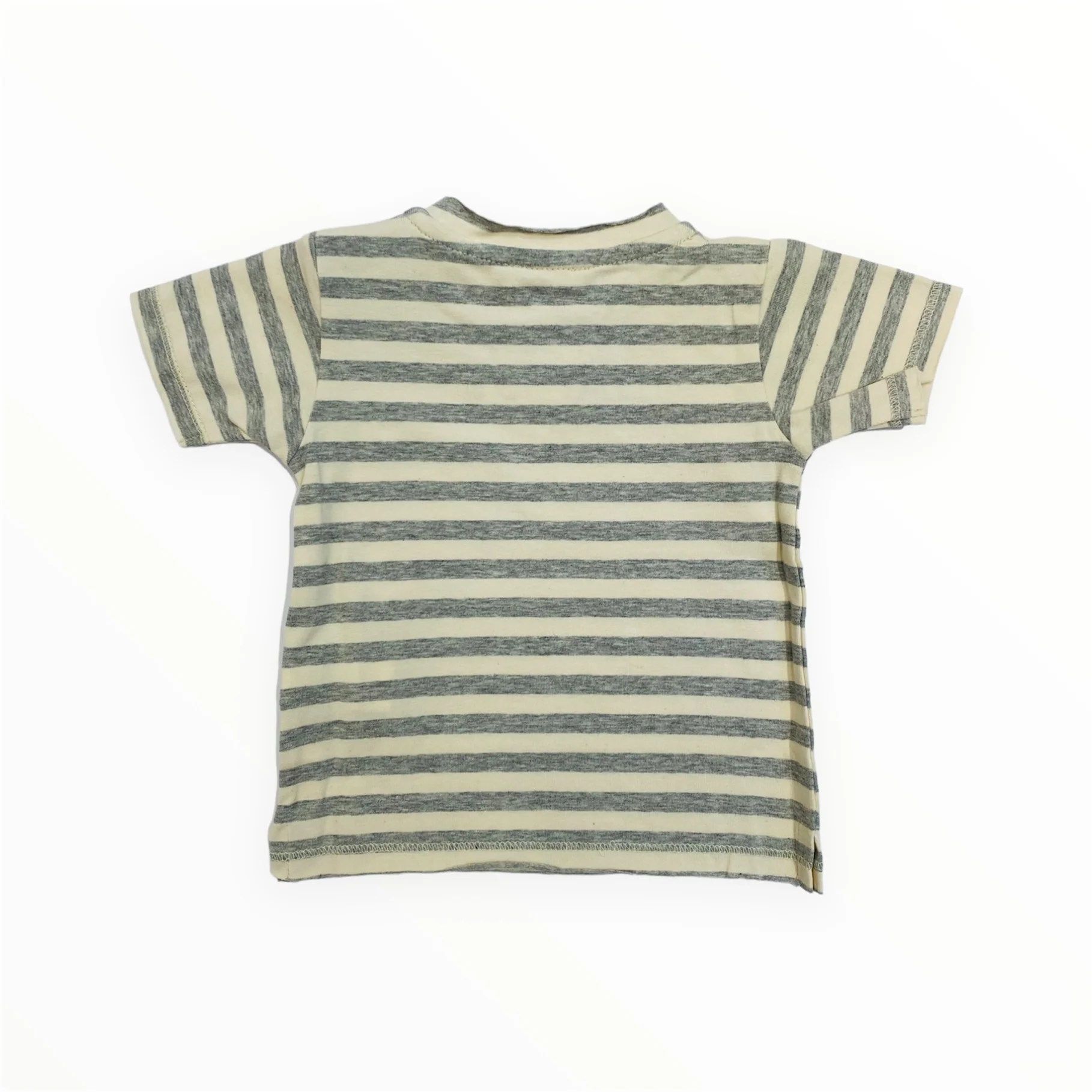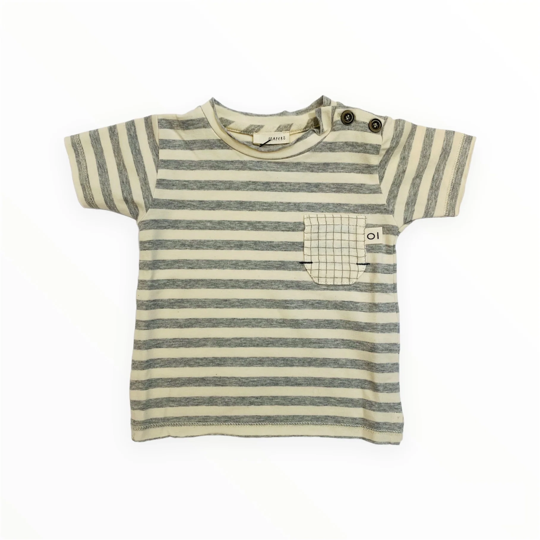 T-shirt manica corta a righe grigio/avorio con taschino a quadretti, cuciture a taglio vivo