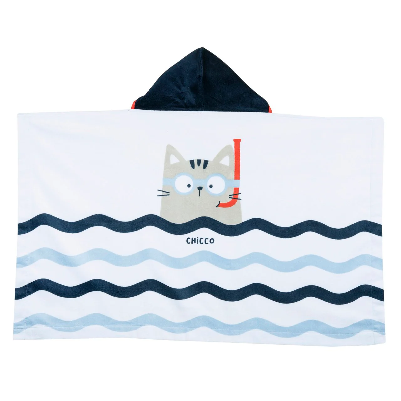 Telo mare in spugna di cotone con cappuccio Cappuccio blu a contrasto Macro stampa gatto e onde Prodotto con Certificazione Oeko-Tex: la qualità per il tuo bambino