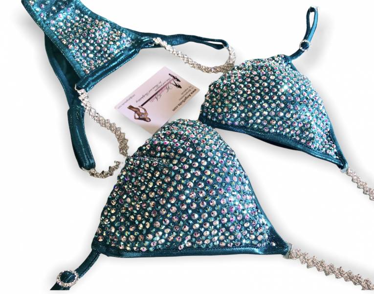 BIKINI verde teal MIST, decorazioni original swarovski Crystal AB and blue zircon 1:1,