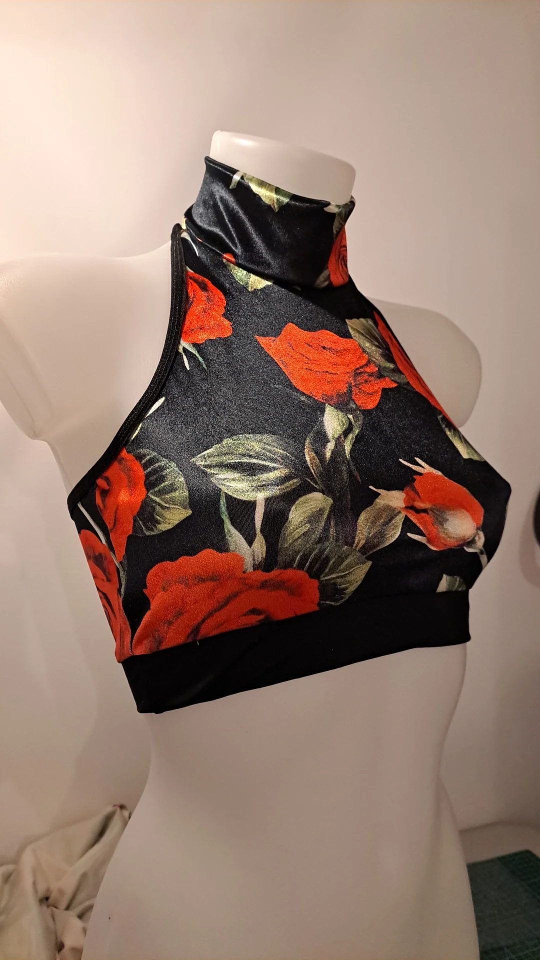 top dolcevita altochiusura collo con velcroschiena nudatessuto velluto rosebordi elastici neri