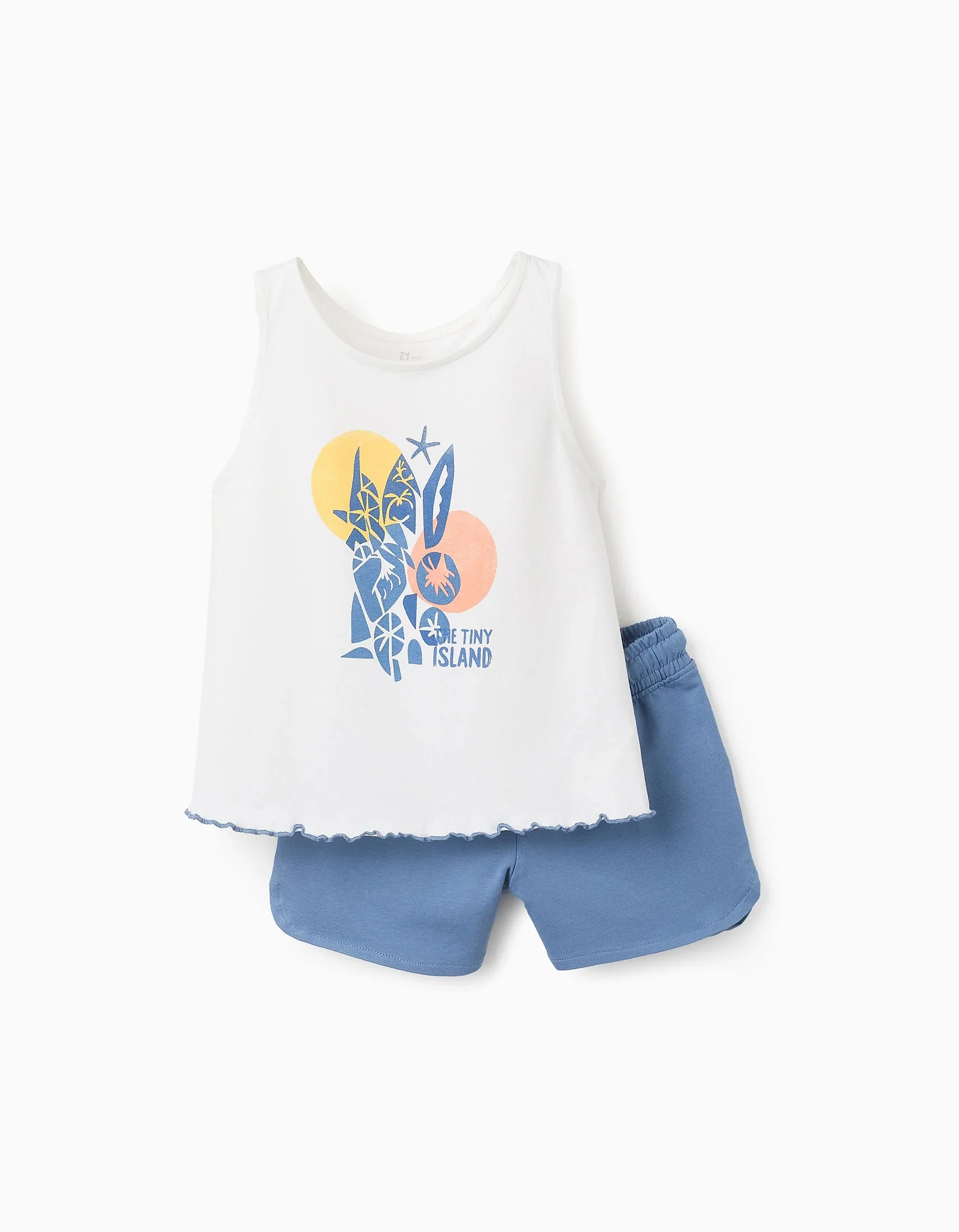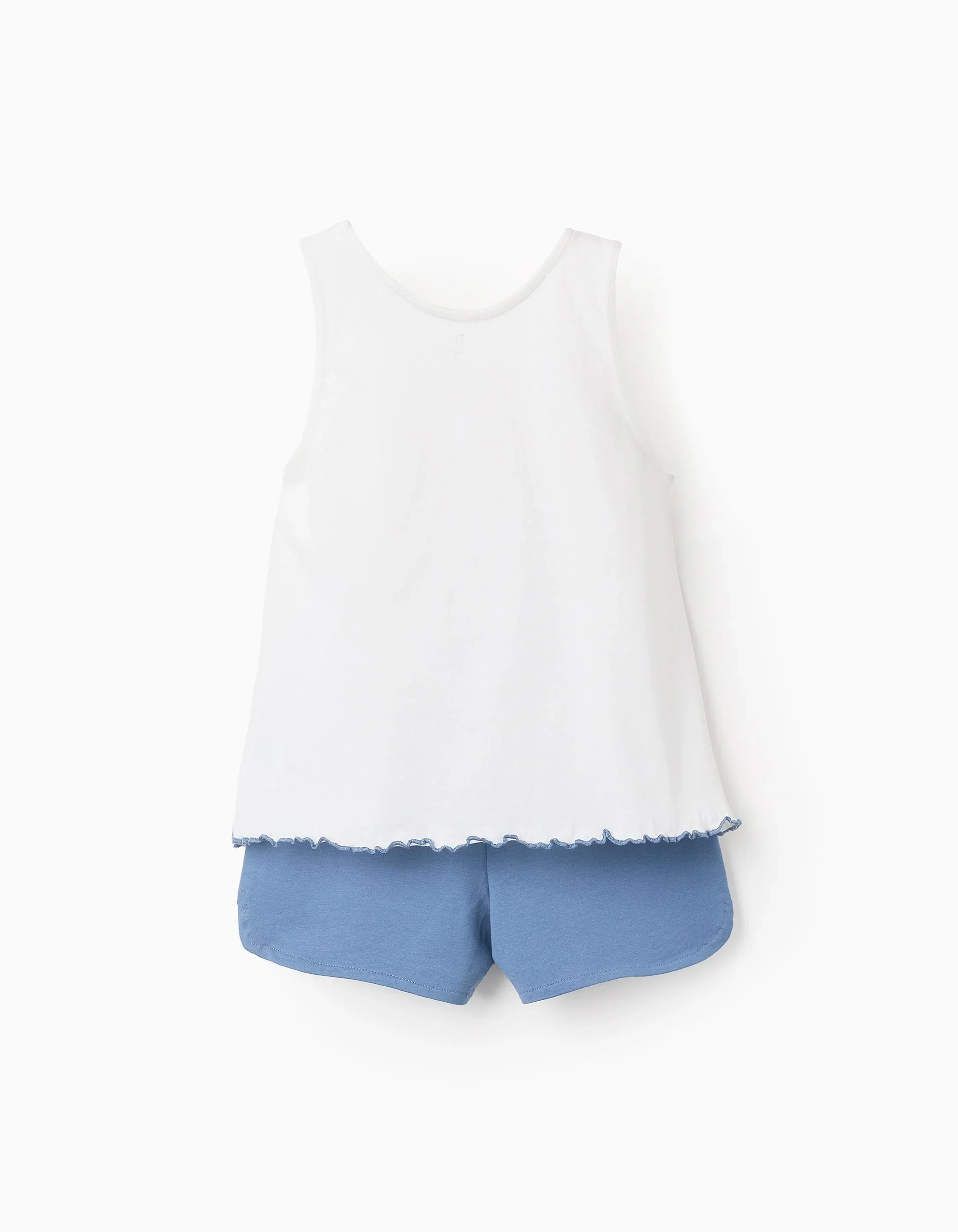 Completo due pezzi per bambine. È composto da una T-shirt bianca in 100% cotone con stampa frontale e base effetto ondulato; e pantaloncini blu semplici, con elastico in vita e coulisse. Etichetta interna stampata per evitare irritazioni alla pelle. Ideale per l’uso quotidiano!