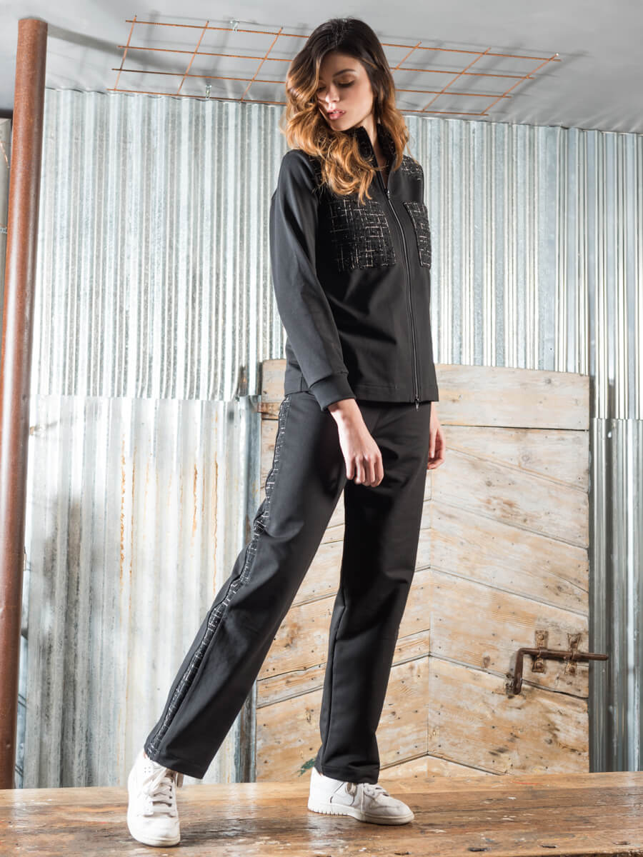 Tuta sportiva con giacca con cappuccio chiusa con zip. Pantalone liscio con bande laterali.