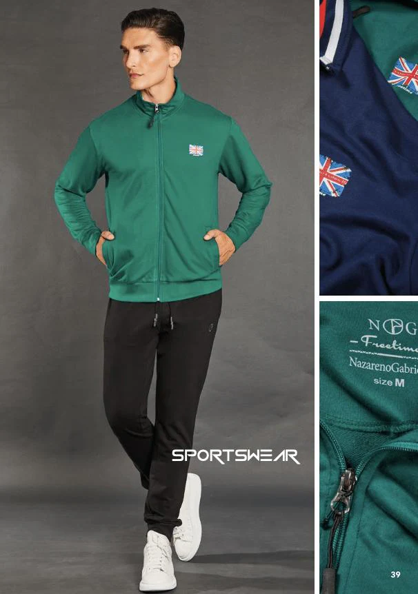 Tuta garzata uomo con zip centrale e tasche, maglia collo alto e pantalone con tasche, fascia e coulisse di Nazareno Gabrielli, il tutto in tinta unita con doppio colore.